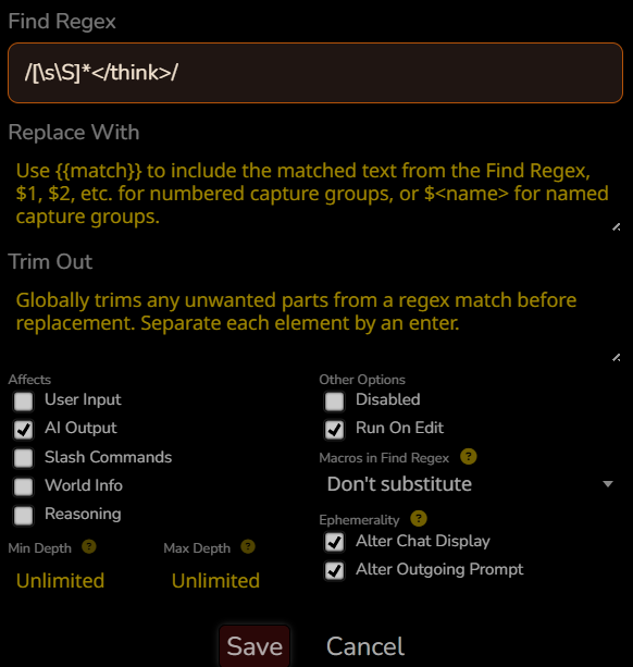 >>1482357 А какой у тебя префилл, с уже начатой думалкой? Открывающий тхинк надо ставить регексом или таверной, закрывающий задавать открывающим через префилл или, если нравится завышать температуру чтобы она фантазировала другие теги, регексом менять на нужный.