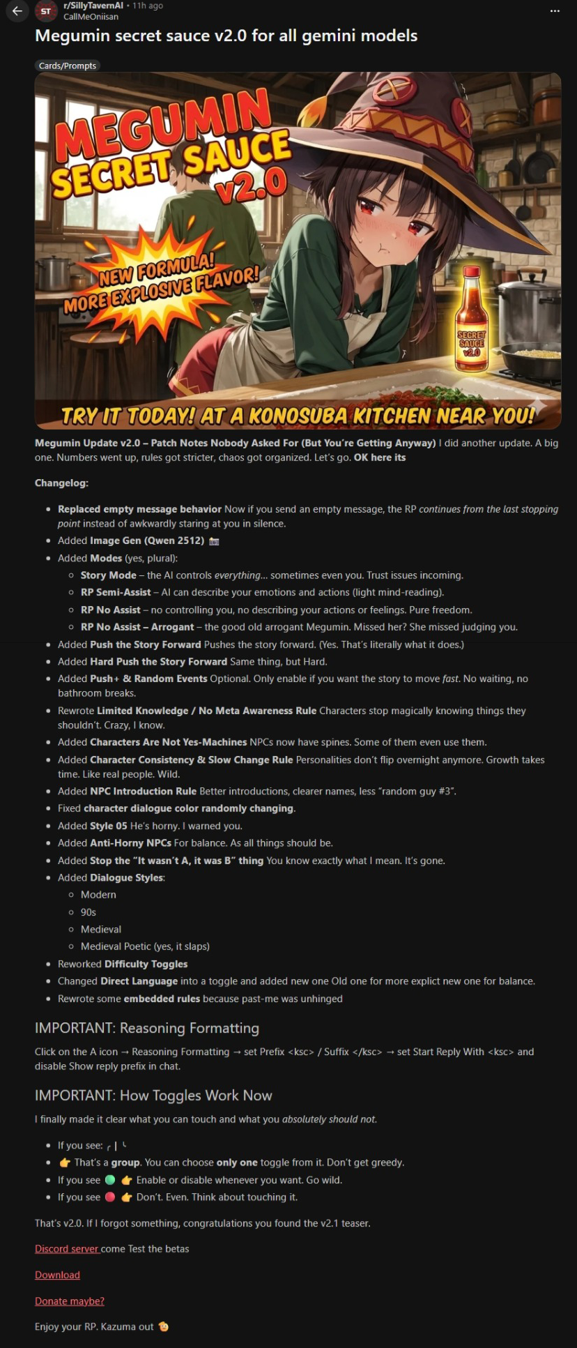 >>1481748 Кроме этой проблемы именно с безжопным расширением всё чётенько (ещё бы придумать как аватарки прикрутить...). Я его использую исключительно для склеивания карточек в одну: всех персонажей кидаю в мут кроме одного, выбираю не скрывать замьютеных чаров и все дескрипшены красиво кидаются в пресет между тегами <characters>, нужные лорбуки сами подтягиваются и сценарии ручками добавить. В остальном не функционал, а рудиментарная залупа, но имеем, что имеем.