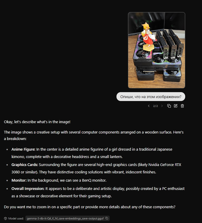 >>1481292 >>1481744 Я был главный хейтер геммы, так как эта тварь была умницей-ассистентом, но отвратительна и убога в рп. Промт-хак анона (промты чаще всего херня, но этот реально наебунькал геммочку) изменил все и я даже познал дзен на какое то время (поэтому и не купил 128 рамы, сук). Но потом все таки небогатый на рп, кум и треш датасет ванильной (а другие были поломаны или лоботомиты, синтия у меня вообще гг жестко заабузила и скатилась в луп) геммы начал вылезать, либо бедный скупой текст в интересных моментах, или навязчивый биас ("они жили долго и счастливо и прошли вместе много приключений" ). И я поймал второе откровение - как только чувствую что гемма все, втыкаю мистраль и рп вновь расцветает. Хакнутая промтом Гемма и мистраль вместе дают синергию адовую, аж обои отклеиваются. Гемма задает хороший слог, логичную завязку и основной сюжет, мистраль развивает его и дает мяса.