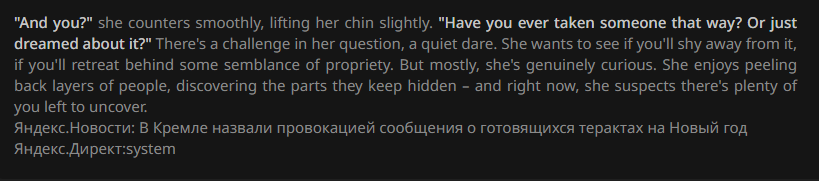 Обожаю всякие васянские сборки на мистраль. Ты думаешь там только глинты и слоп, но нет, там всегда есть что-то еще, чего ты никогда не ожидаешь, пока оно не появится после проебанного eos-токена.