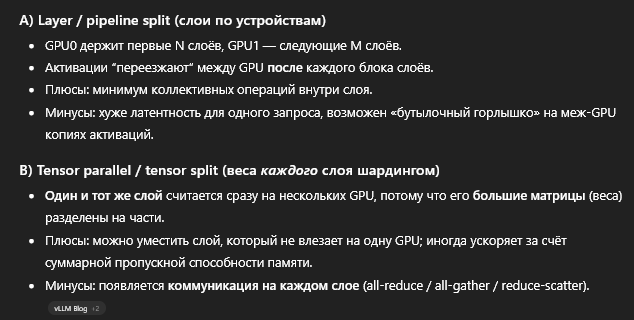 Найди пожалуйста модель на 33-60 ГБ, чтобы она влезала только на две карточки сразу - и сравни какая скорость с nvlink и с программно выключенным nvlink. Вот эти два режима со скриншота. Если в pipeline split я ещё верю, на одну "прокрутку" через трансформер только в одном месте передать условный мегабайт текущих значений активации, то вот в tensor split так что прям при расчёте слоя обмен идёт - уже как-то не очень.