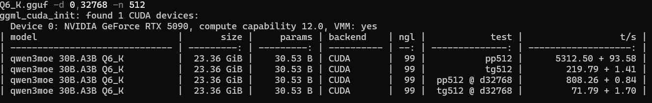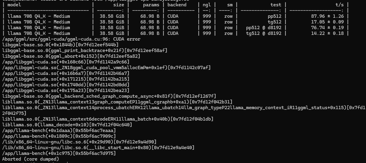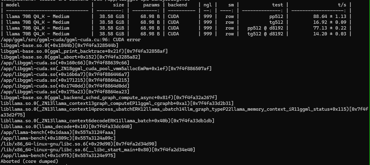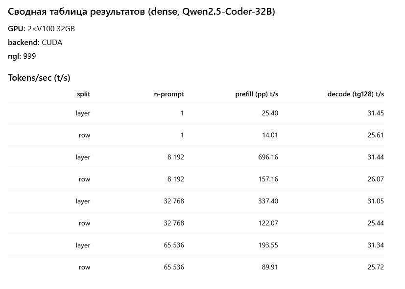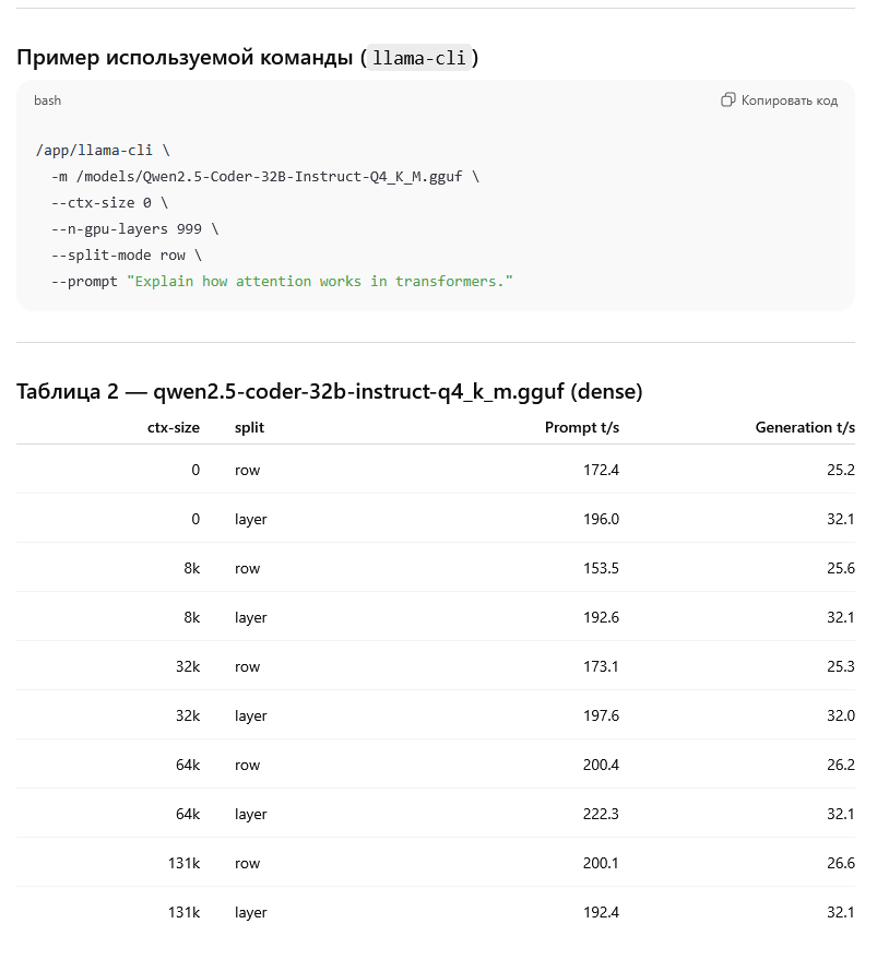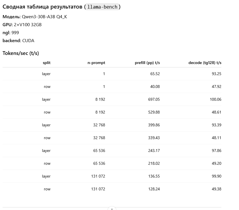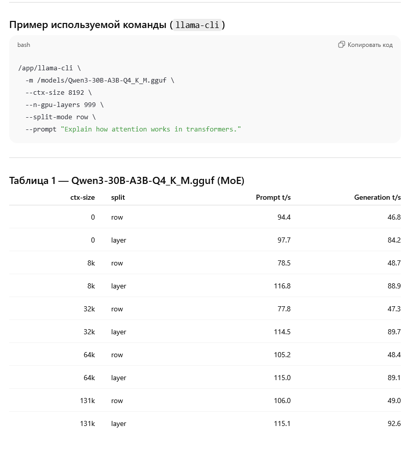 >>1481206 первые два скрина это лама бенч пример /app/llama-bench \ -m /models/Qwen3-30B-A3B-Q4_K_M.gguf \ -p 65536 \ -n 128 \ --n-gpu-layers 999 \ --split-mode row \ --no-warmup на 131 он не стал запускаться, зафейлился