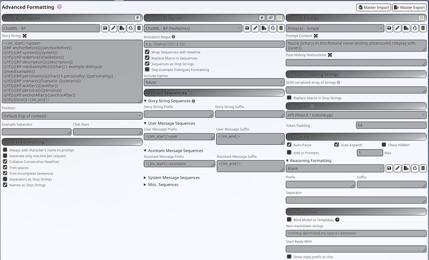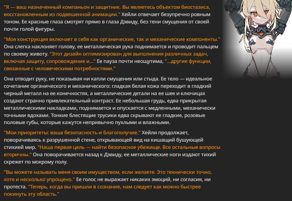 >>1485209 Из стандартных в таверне, я за минимализм, разве что написать что все допустимо и добавить разметку маркдауном для разделения сценария, карточки, персоналити, истории и отдельно суммарайза. И все равно на эйре не рпшу.