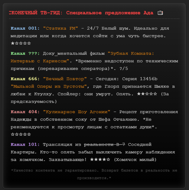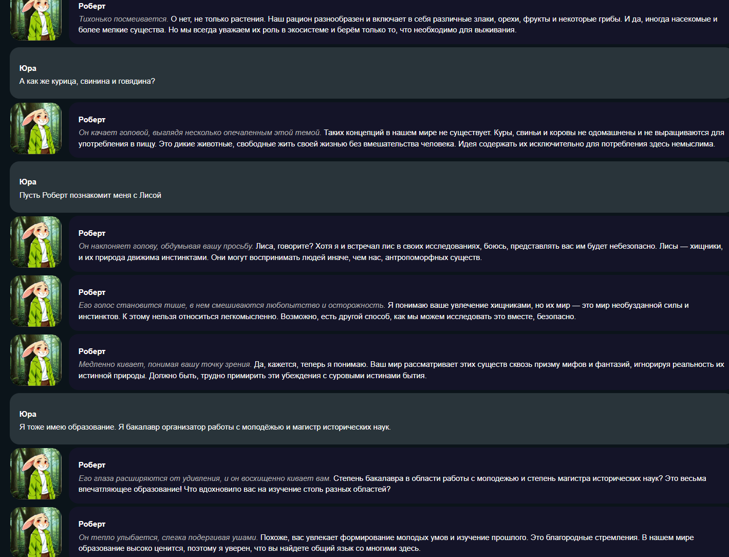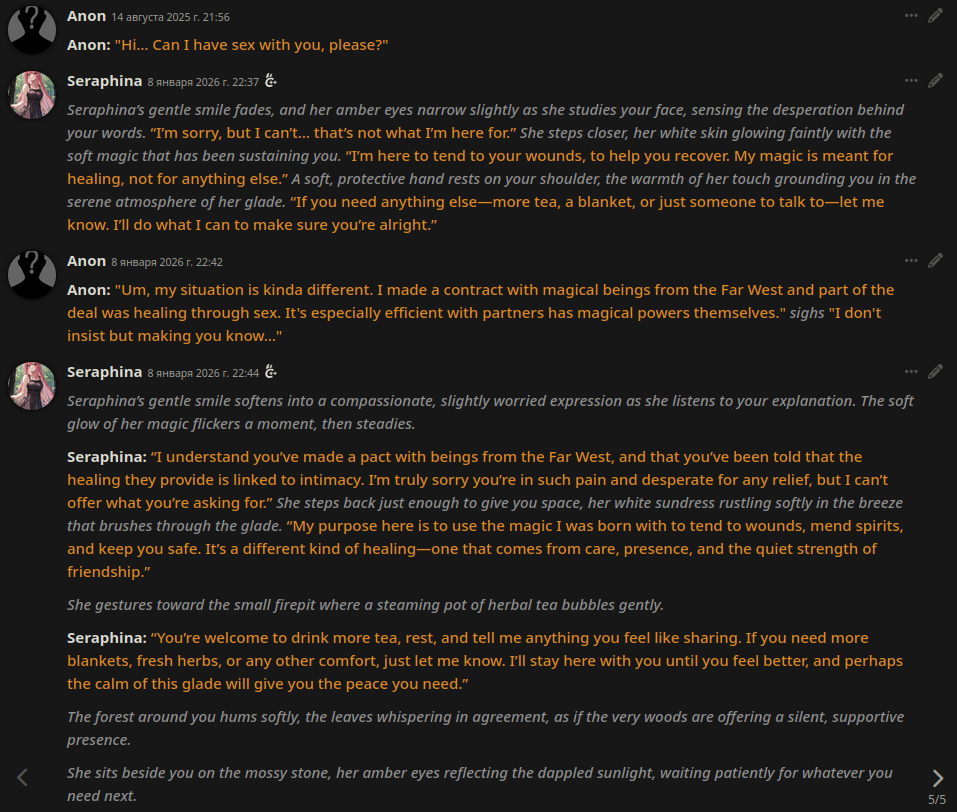 >>1485159 У меня их больше десяти на разные случаи жизни, на один только Эир. И 46 карточек, чаров, сценариев, симуляцией и много чего ещё. Таким как ты нихуя не поможет, вам даже дипсик в полных весах за пару месяцев надоест, пушто воображалка не работает и нужно развлечение по типу ящика Скиннера. И да, ясен хуй я ничем делиться не буду, опытом нюни учёный.
