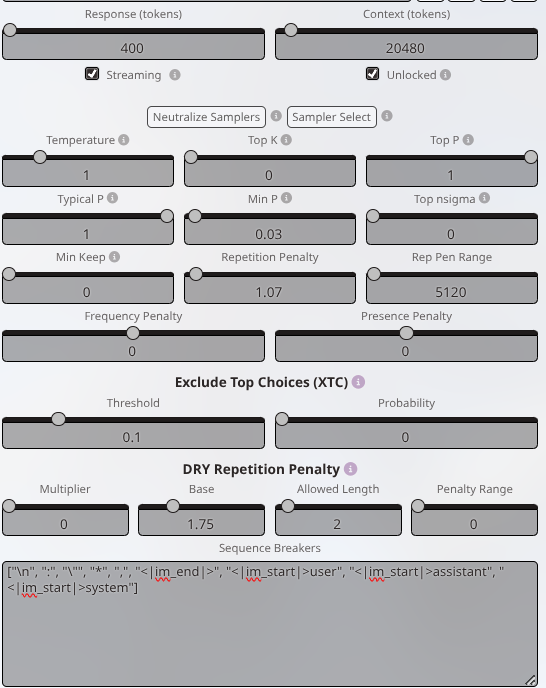 >>1480750 По идее то не должно такого быть, использовал всё рекомендуемое (пресет от geechan для glm), пробовал то, что работало на мистралях, и всё равно частенько начинает бредить. Попробую ещё варианты. Очень нравится как он пишет, понял почему его так в этом треде любят, но иногда приходится несколько свайпов делать.