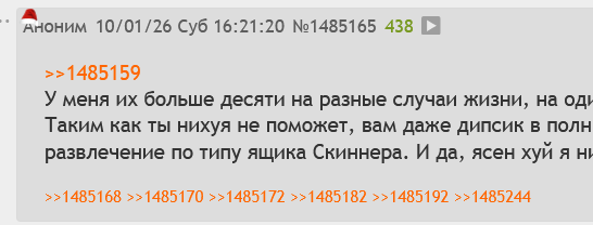 >>1485206 > ты - и есть рак этого треда > Кто не приносит ничего полезного, не развивает интересных дискуссий А что, ты играешь в неймфажество и записываешь меня в кого-то? Я в свое время много чего приносил в тред, несколькими месяцами ранее. Потом понял что это никому нахуй не надо, умные люди и так разберутся а обрыганы будут обрыганами и дальше. >>1485207 > Ну или ты просто чушка Ору как трясет итт макак когда им нос утирают в их собственной беспомощности и нежелании хоть что-нибудь делать самому, а не ждать пока корм из кормушки на голову свалится. Усмевался над вами, усмехаюсь и буду дальше усмехаться.