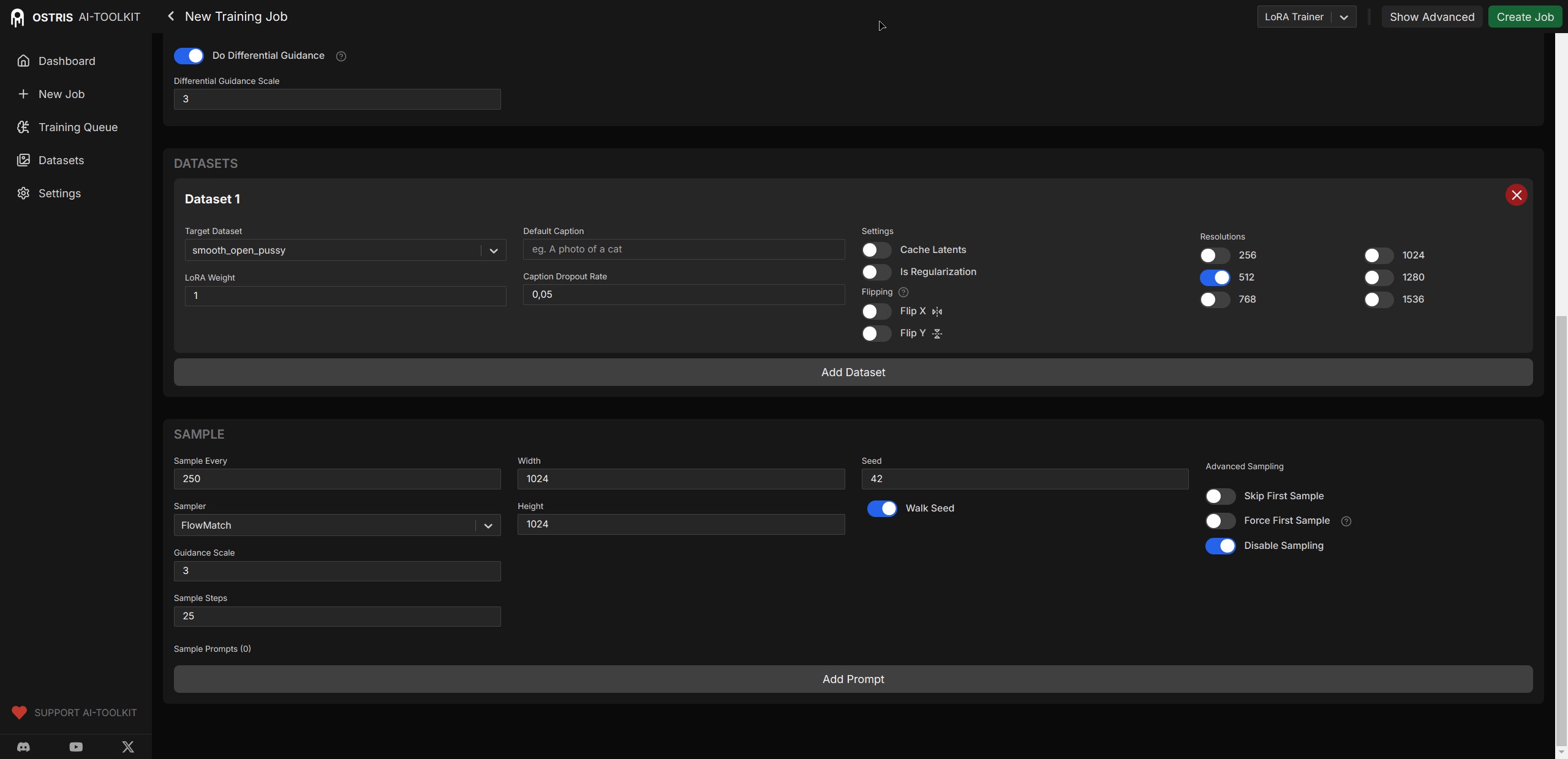 >>1486074 >ZIT? Да > самого важного нету Не оч результат порадовал, там собственно все плохо. >200-400 шагов начинается набор мелких деталей Странно, я когда тренил датасет 35 картинок, что то вменяемое начало появляться после 2500, скорее всего что-то с настройками или с промтом семплов. >Желаемый объект должен занимать ~60-70% изображения. Ну то есть pussy крупным планом все пикчи или часть из них с позой для понимания сеткой где эту pussy располагать? >Кроме того, некоторые изменения в картинке (в том числе и лицо) могут быть в порядке вещей. Спасибо, анон, буду иметь ввиду. Настройки прикрепил, ну там все как ты рекомендовал в прошлом треде, единственное оставил AdamW8bit по умолчанию и в этот раз из-за нехватки времени решил обойтись без семплирования.