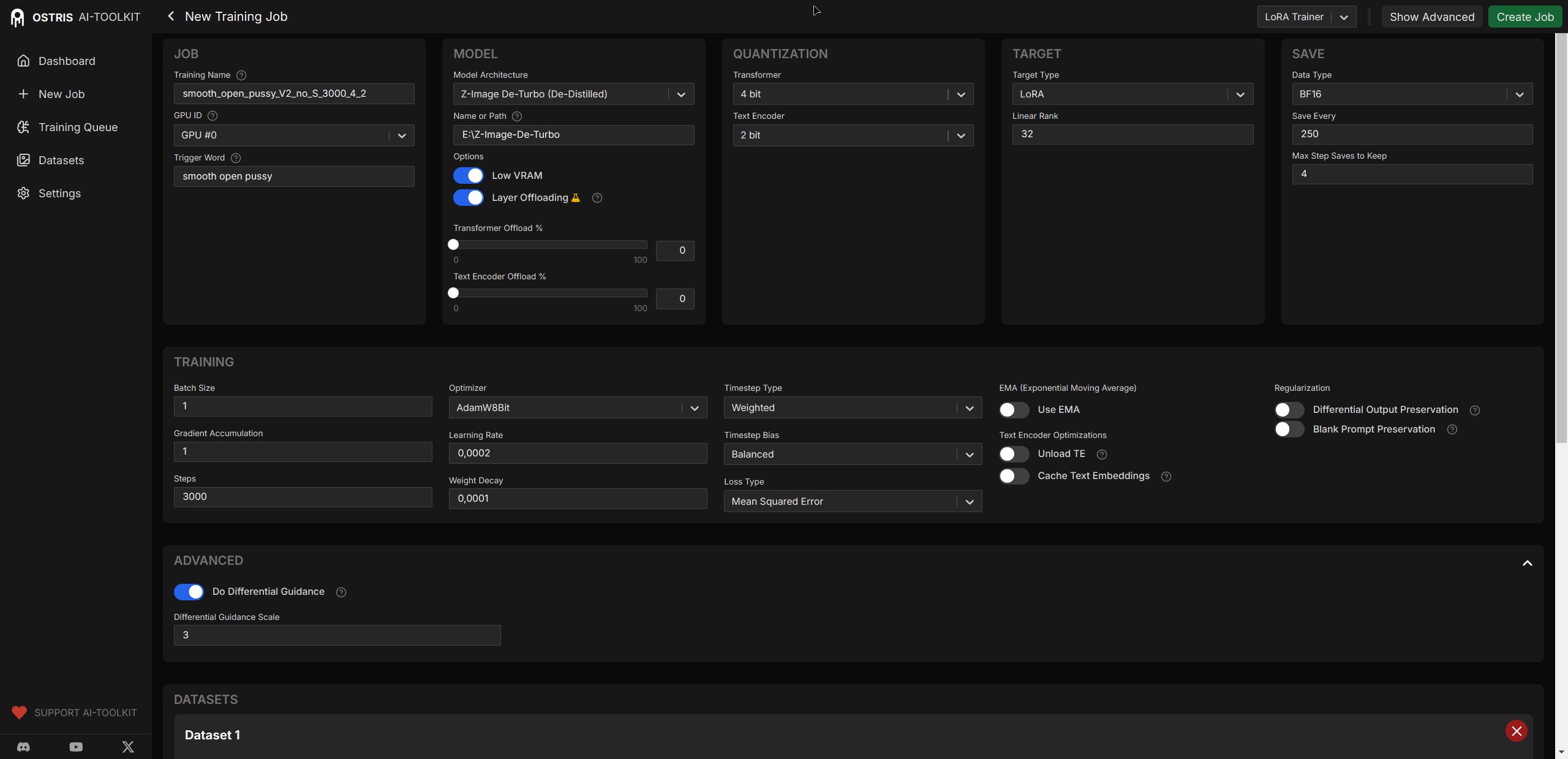 >>1486142 В Advanced, Do Differential Guidance - вырубить. Оно не для ZIT. Сверхагрессивно и слишком грубо получается, процесс шатает, лора не устаканивается.