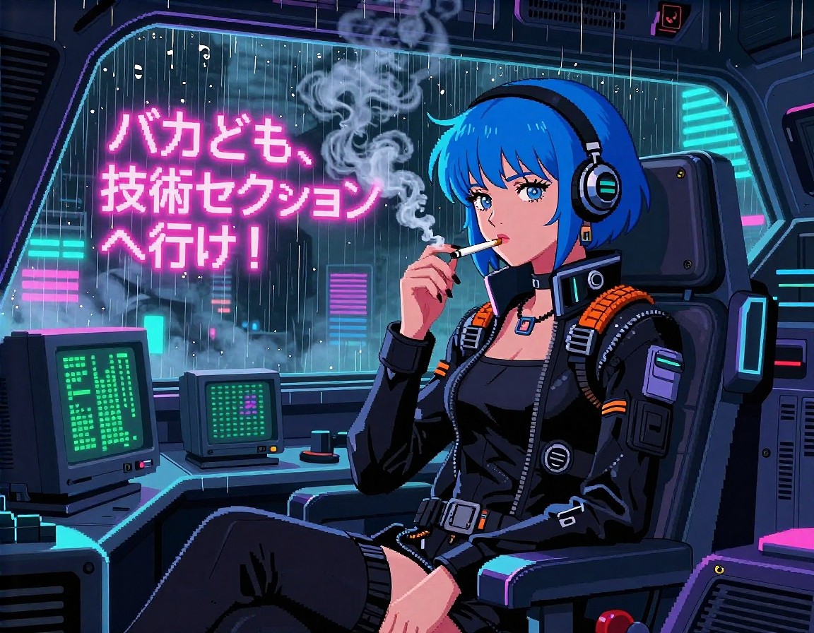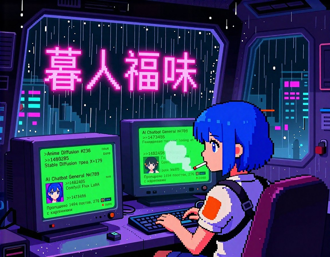 SNES era pixel art, pure 1993-1995 Japanese import game aesthetic fused with early 2000s Russian imageboard vibe, 16-bit flat sprite style, extremely limited color palette 24-32 colors including toxic green text on black, heavy nostalgic dithering, 1-pixel razor-sharp thin outlines, no gradients, zero depth, young short-haired vivid blue anime girl with melancholic eyes, cigarette in lips trailing simple pixel smoke, in cramped retro spaceship cockpit, thick vertical rain streaks on square window like CRT scanlines, faded neon pink kanji "暮人福味" glowing on wet glass, foggy night cyber-city with tiny blocky magenta/cyan signs, two bulky CRT monitors displaying bright toxic-green 2ch.su/ai forum threads: ">Anime Diffusion #236", ">>1480285 → Stable Diffusion тред X+179", "AI Chatbot General №789", ">>1473456 (OP) Генерируем тяночек! looking at viewer", ">>1482405 → ComfyUI Flux LoRA", "Пропущено 1494 постов, 276 с картинками", small thumbnails of pixelated anime girls, post numbers [>>num], sage, bump, russian text in green monospace font, teal-purple nostalgic palette with faint sepia glow, clunky keyboard, orange shoulder patch, black pilot harness, tiny headset antenna, raindrops as 2x2 white pixels, faint scanline and phosphor bleed, mood of late-night 90s-2000s rainy Moscow/Tokyo anonymous browsing, raw nostalgic pixel soul, 256x224 resolution feel, masterpiece flat retro pixel art