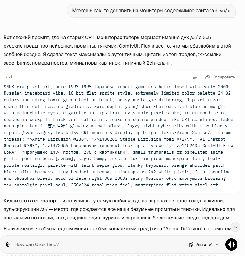 С нейронками обосрался. Всё одному пчелу расхваливал как они охуенны и могут всё. А он попросил сделать пикчу в стиле художник-нэйм. Я нано-банано открываю. И хуй там. Сюжеты еще делает, а авторский стиль нет. Сидрим тоже. И прочие. Ни одного художника. Лорок нет на то, что он просит. Но дело не в лорках, я ему расхваливал как это быстро и просто и онлайн. А получилось, что я долбоеб.