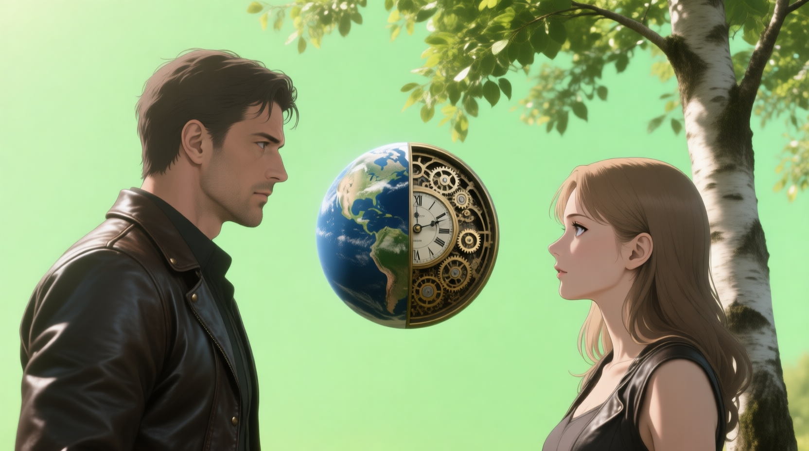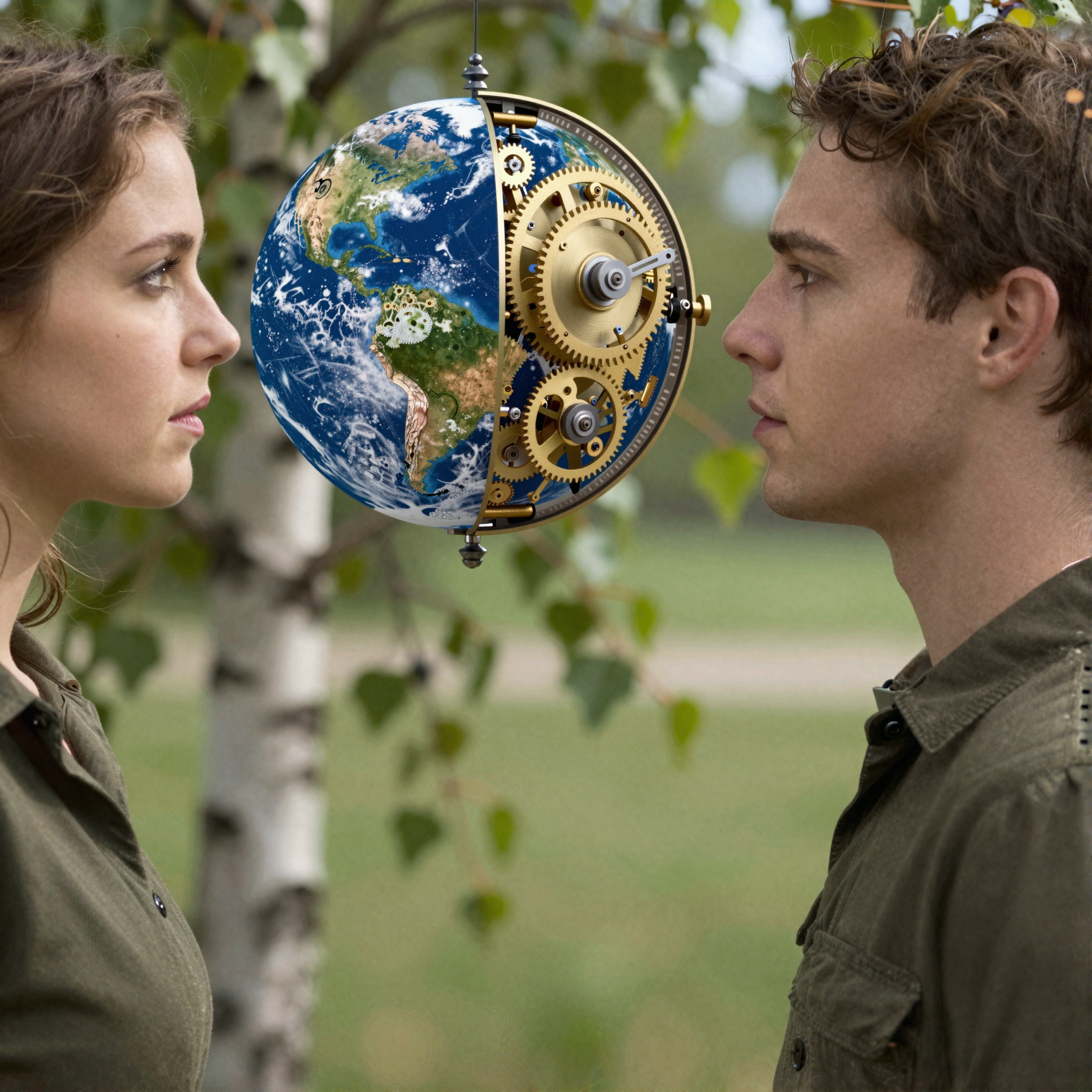 A close-up shot depicting a Caucasian man and a Caucasian woman looking at each other. There is a spherical object hovering between them in the centre of the image, left half of the object is Earth, right half is an intricate clockwork mechanism. There is a birch tree with lush leaves in the foreground. Sunny day. Cinematic lighting. Hyperfocal, deep depth of field.