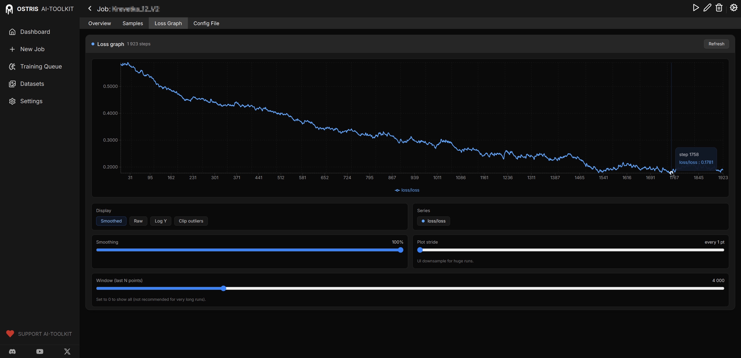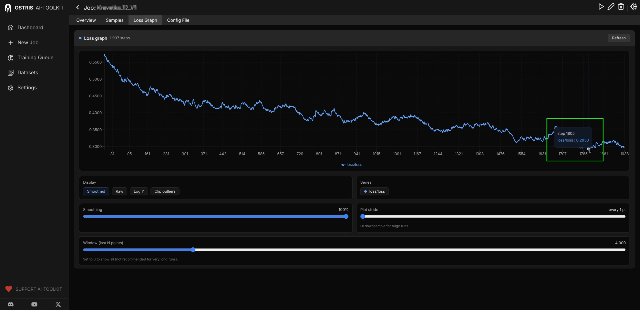 В последних версиях Ostris добавили график Loss Rate. Для ZIT он показывает совсем не то, что для сдохли. Чтобы увидеть закономерности ползунок smoothing надо двигать на 100%, иначе "забор" видишь. В картинке ХОРОШИЙ график с одной из моих удачных тренировок. Там был большой датасет на концепт, на 133 картинки, на графике два места где было совсем хорошо, и я брал эти чекпоинты за финальные. Первое - шаг 931, и второе - 1596. Далее пошел однозначный оверфит (даже в конце графика, где опять спад около 2000 - это уже не спасает, лора испорчена), а просто в промежутке было фиговато, но все же без оверфита. При этом loss даже в удачных местах > 0.4, что очень много если по классике. Но ниже - не падает на таких настройках.