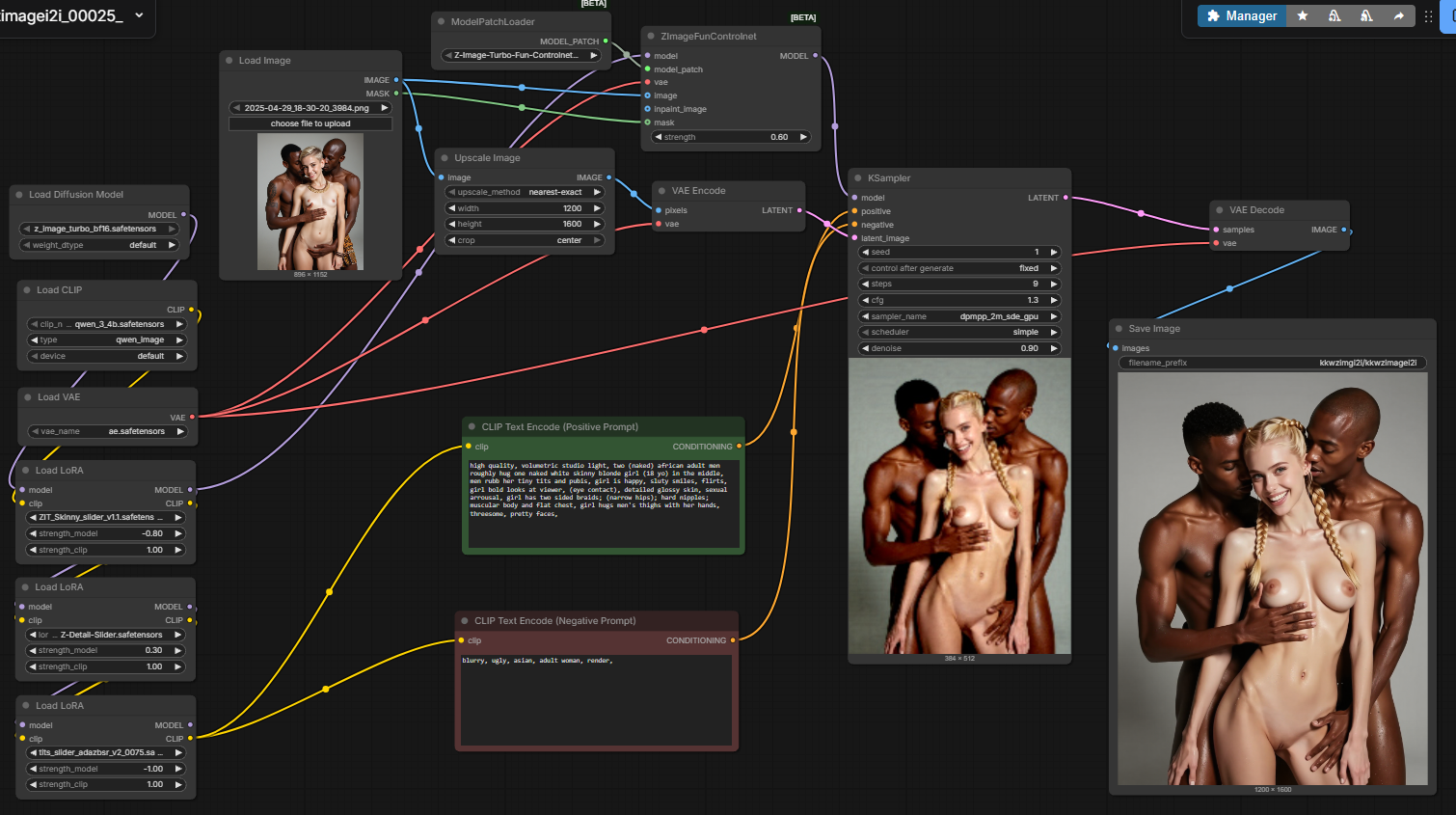 Я до сих пор в ахуе, но Лабы таки выкатили что-то, боле-менее удобоваримое в этом плане. Только то и напоминает о том, чья она, что если настойчиво не указывать "naked" 2-3 раза - пытается хотя бы тонкие стринги надеть. :) Зато в нормальные соски может сама (у ZIT они - хм...) С маленьким нюансом - в промпте надо прямо писать "соски и ареолы", иначе ленится. Показательный случай, пробовал edit на позы. Исходник - фото голой женщины которая грудь прикрыла рукой. Заказал: перемести руку с груди ко рту (типа поза испуга, прикрыв рот чтобы получилась). Первая же попытка - все сделано, но открывшаяся грудь - анатомия манекена. Дописал в промт "... и теперь видно соски с ареолами" - поняла, и сделала как надо. В режиме edit при переносе фигуры с одной картинки на другую сиськи-письки тоже переносит. Edit вообще хорош в понимании чего от нее хотят. Утверждать не буду, но по личному впечатлению - квен сосет. Делает любой заказ - и позу, и стиль, раздеть, одеть, поменять персонажа с картинки 1 на персонажа с картинки 2 - целиком или только детали. Или даже взять с картинки 2 анимешного персонажа, сделать из него фото, и добавить на картинку 1. Правда, есть тонкость - к артиклям английского чувствительна. Иногда крайне важно - написано в запросе без артикля, с "a" или "the". Такие вот впечатления пока...