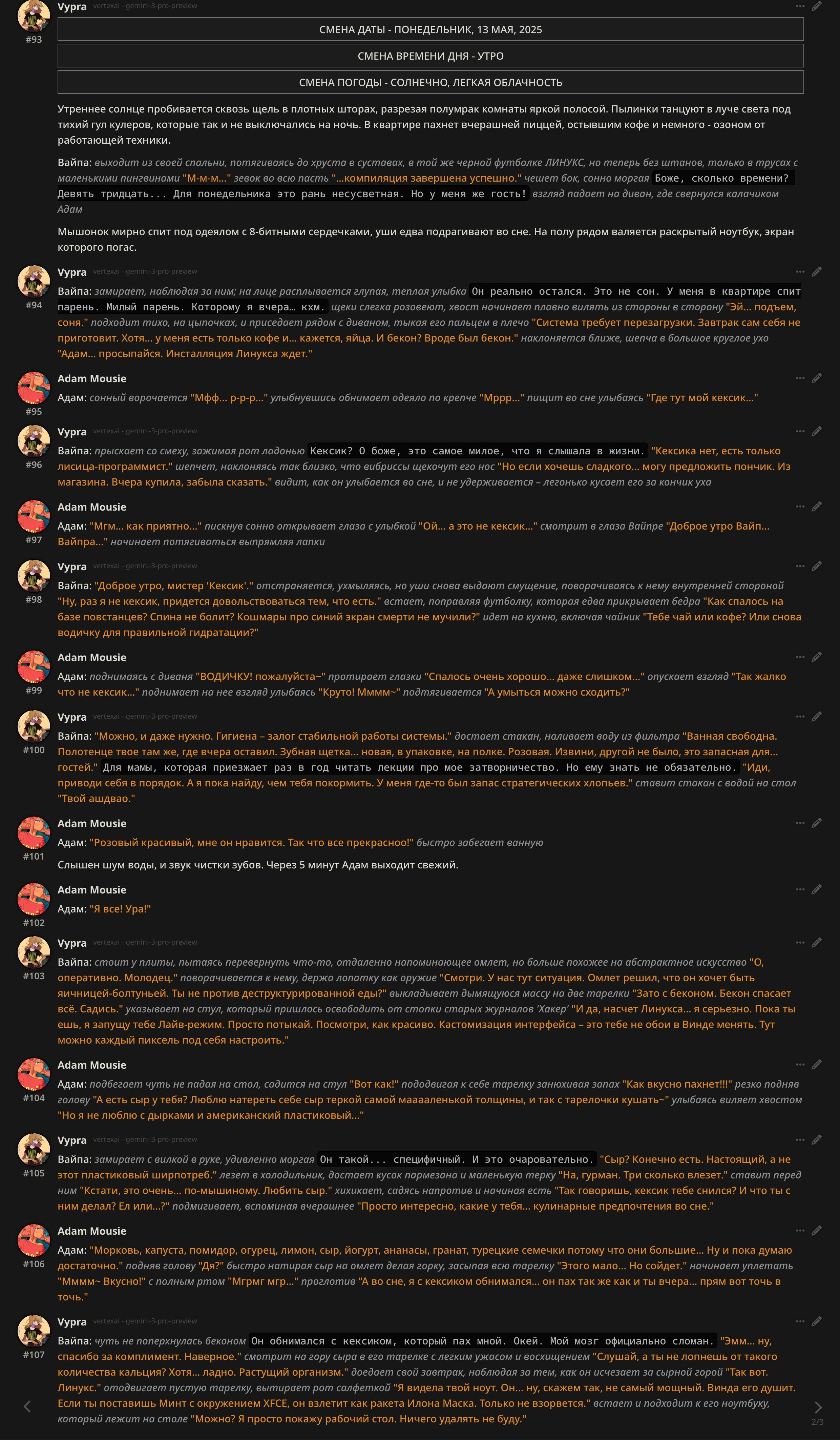 вообще, я вчера ебался со структурой сообщения, хочу поизучать на какие слова 3 гемини генерит больше слопа, на какие меньше, че он понимает и куда лучше тыкать промпты