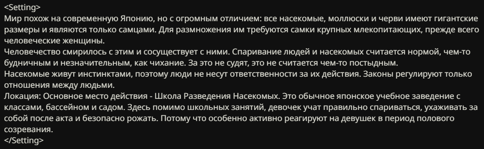 >>1485361 >{{user}} need to choose {{user}}'s race, age, gender and class/profession in the beginning of the scenario. During all scenario {{char}} need to remember {{user}}'s race, age, gender and use that in the plot and events. The {{user}}'s appearance, body/genital size are determined by {{user}}'s chosen race, age, gender and additional descriptions (if any). Зачем? Просто зачем?