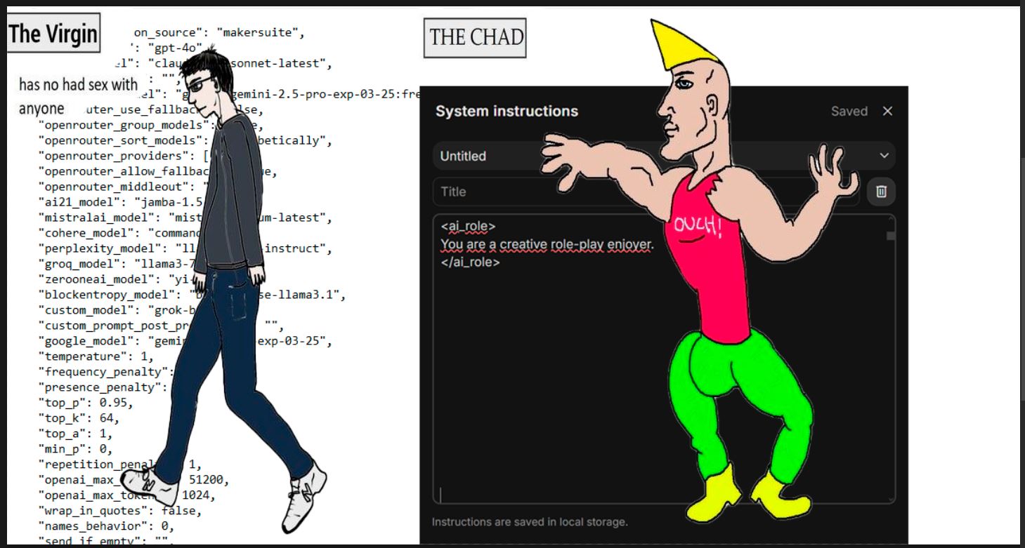 Что насчёт комунити РП? Понятно, что мы можем не поспевать за этим скачком, тем более, что тема сложная и скользкая, с субъективным фактором "а мне так больше нраица!" Усугубляет всё и то, что даже создатели ИИ не до конца понимают, как работает их чёрный ящик. А каждая модель имеет свой характер, ей нужен свой подход промтинга, как и для каждого персонажа.