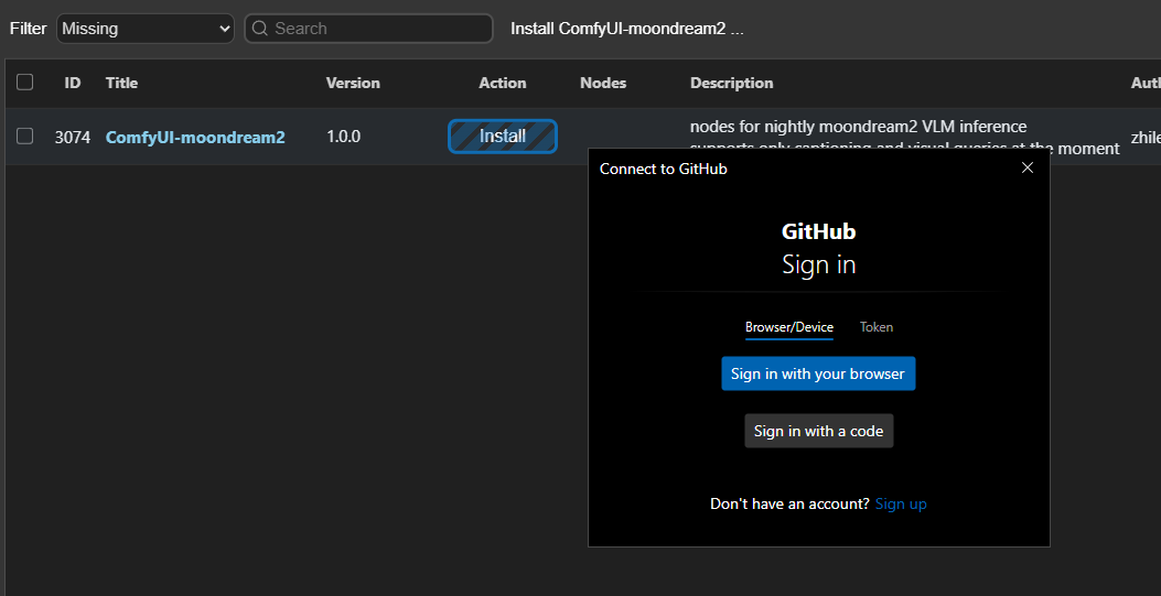 В воркфлоу пакеты moondream. Не ставились пока не поменял уровень безопасности в комфи. Поменял, теперь просит авторизоваться в гитхабе. Че за прикол? С каких пор нужно зайти в гитхаб чтобы скачать пакеты?