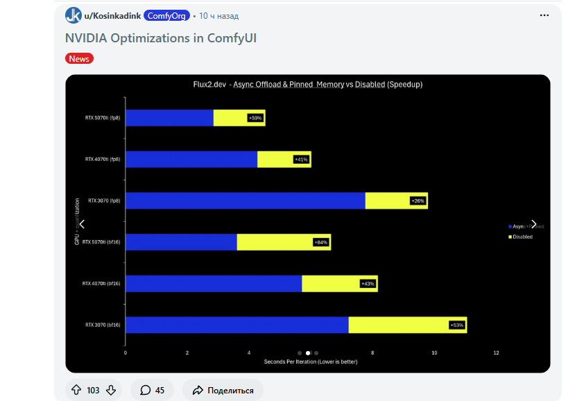 А может это все тут не причем? Асинк энд пинд давно включили, пишут — возможно, я как раз видяху менял с 4070 ти на 5070 ти в декабре. А нвфп4 ускорялся на глазах в комфи — от «медленнее фп8» до «чутка быстрее», но качество в лтх было говенным в фп4.
