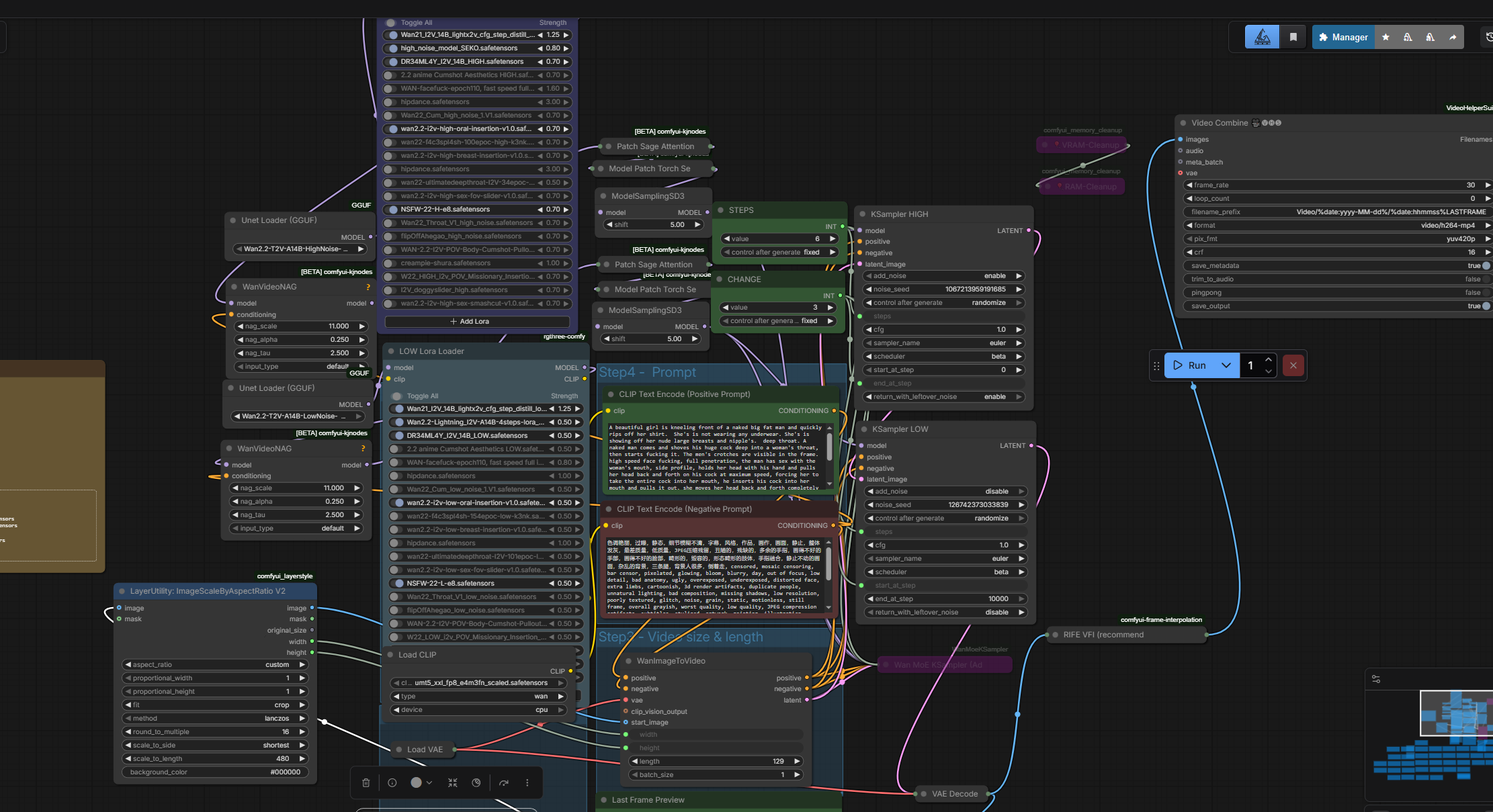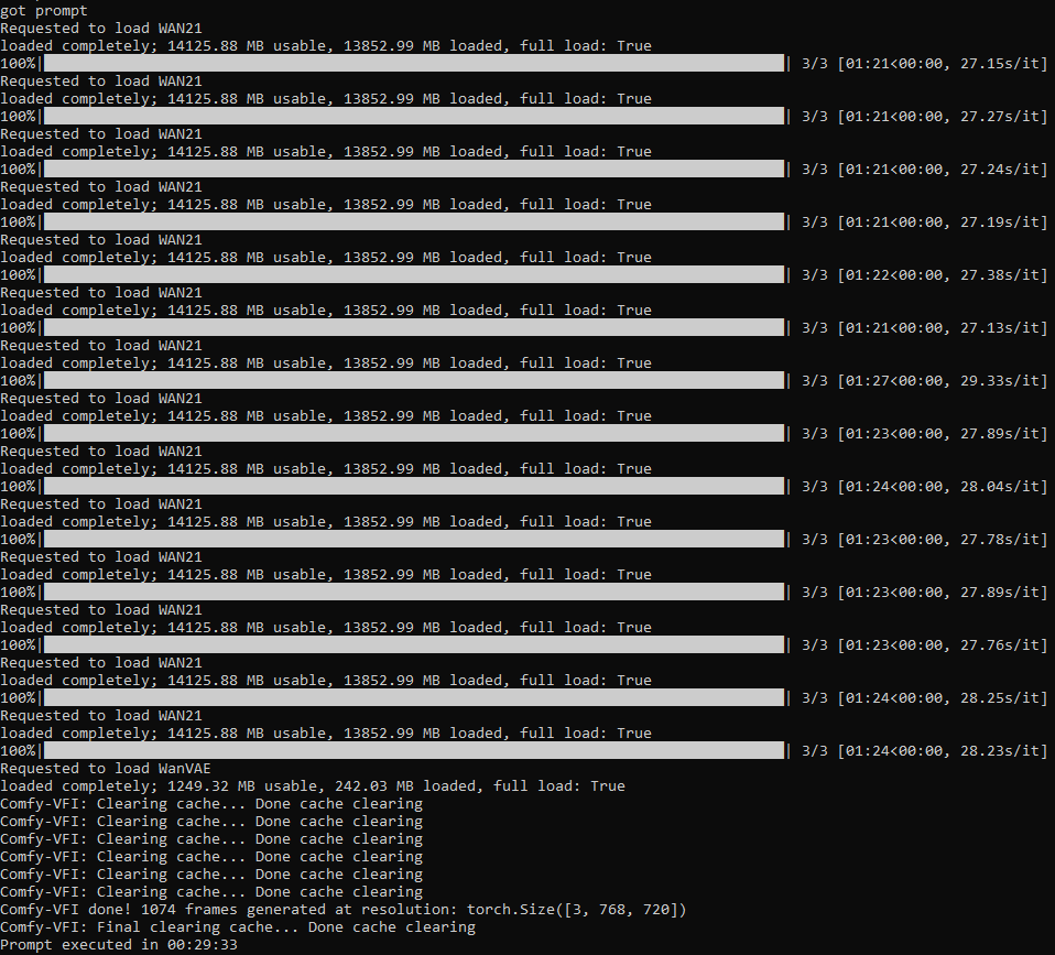 Хай и лоу стадии проходят быстро для одного видео в 5 секунд (в районе пары минут на саму генерацию), но вот свич между хай и лоу моделями происходит долго. Получается так, что ждешь загрузку хай модели -> генерация хай части прошла (примерно минута) -> ждешь загрузку лоу модели -> генерация лоу части прошла (примерно минута) -> ждешь вае -> ласт фрейм пошел к следующему видео в цепочке.