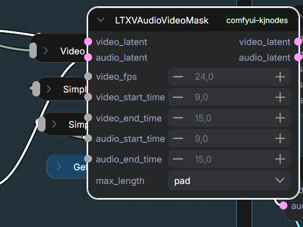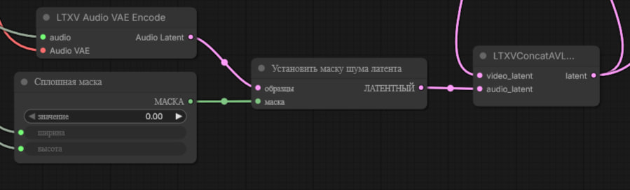 Если вы хотите сделать липсинк (вместо генерации голоса самой моделью), используйте эти четыре ноды. На входе, очевидно: аудио, audio vae, ширина и высота картинки (?), закидываем в аудио-латент перед генерацией (если апскейлите — наверное и туда тоже, хз, не помню как там чо). Хотел сделать себе воркфлоу с липсинком, чтобы не париться потом, к счастью тут не сложно.
