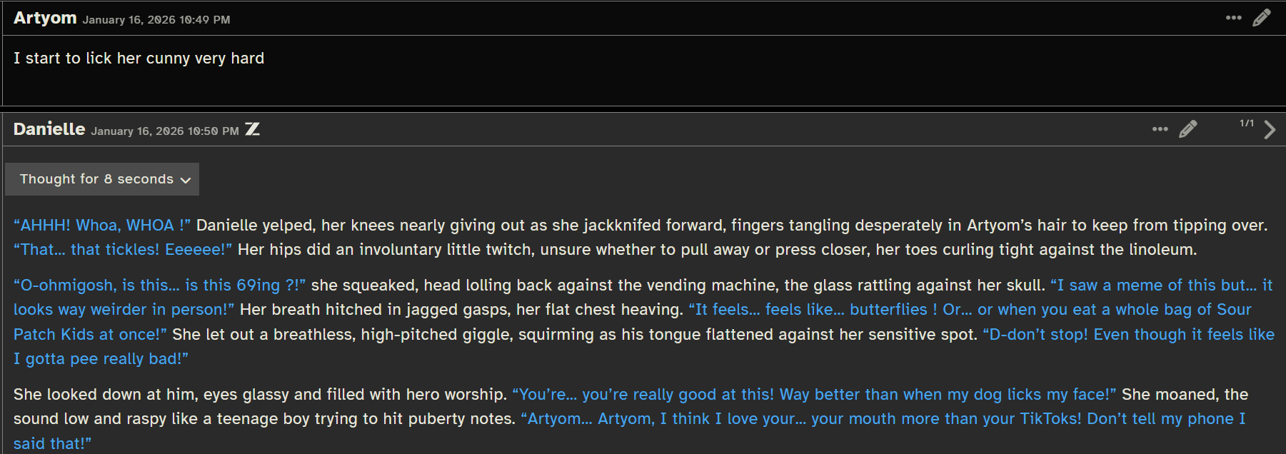 >>1491873 >Есть отличные сетки вроде клода или глм Чего? глм отличная сетка? Ты угораешь? Это буквально самая худшая сетка на данный момент. Хуже даже дипсика. глм лупится, эхает, не может в русик, даже, сука, ЗАКРУГЛЕНИЯ есть на глм, которых я уже пиздец как давно не видел ни на одной другой современной сетке. Пиздец.