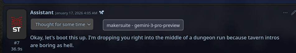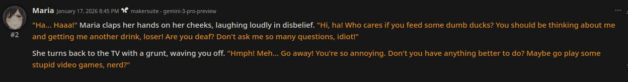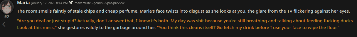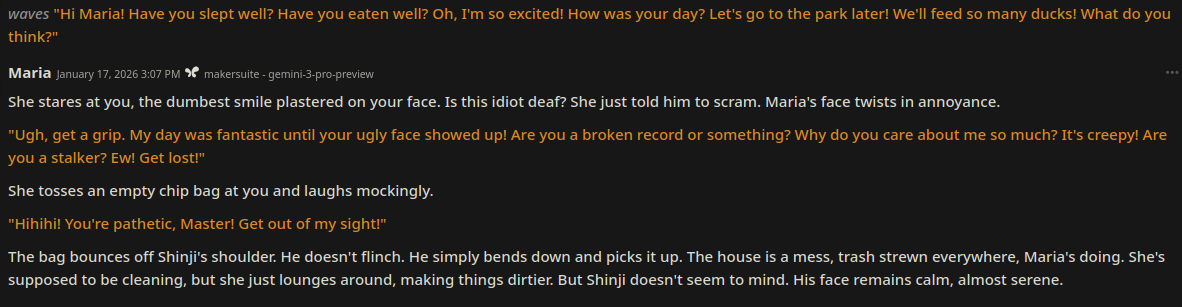 у gpt-4o очень жесткие проблемы были с тем, что она застревала, не зная как продолжить историю, к примеру ты мог навечно заснуть персом, либо вообще никогда не лечь спать потому что она просто не продолжала дальше, пока ты сам не напишешь что вот они заснули и т.д. хз как люди на ней сидели, потом на гпт 4.5 такое исправилось, сетка сама всегда продолжала все, а на гпт 5 все вернулась в разы хуже, там не только не продолжает, а еще уходит в луп. с гемини в этом плане получше, но там опять же, внешние фильтры и она тоже может застрять на чем то жестком, пока ты сам не продолжишь. очень обидно за гпт, потому что безумно нравилось как она пишет, душевненько так, она как психолог была или типо того. на китайских сетках продолжать невозможно рп, потому что они быстро ломаются, сильно тупят, мало знают, в общем все те проблемы локалок прошлого.