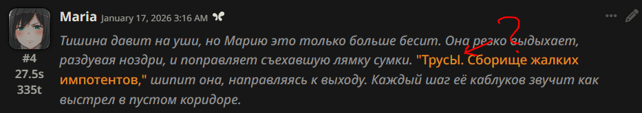 Что делаю и не делаю: — Не юзаю модели, у которых с этим проблемы. Например, слопо-лупиться по дефолту может Мистраль, раньше этим страдал и Дипсик V3, Клоды тоже любят лупиться до 4.5. Лично я юзаю Gemini 3 Pro/2.5 Pro, у них хороший антилуп по дефолту — Не держу большие контексты, обычно играю до 25-32к, делаю короткий самрайз и перезапуск — Отключаю системный промт и склейку сообщений (чтобы модель была более творческой, имхо) — Температура и top_p = 1 (можно экстремально поднять температуру до 2 и поставить top_p 0.8 для более интересного и сочного письма, но немного чаще может вылезать шиза) — Не юзаю на постоянке HTML/CSS/Инфотаблички и прочее украшалки, которые на выводе дают HTML/CSS — Юзаю свой пресет без кастомной думалки на постоянке — Сами размышления у модели на минимуме или в крайнем случае авто (чтобы не разжирать посты) — Не юзаю личность нарратора без необходимости (например, нарратор может быть хорош как антицензор) — Не юзаю комменты к постам на постоянке и любую такую развлекательную доп. инфо к постам — Не юзаю на постоянке расширения с кастомными промтами, особенно длинными, которые могут влиять на интеллект модели — Карточка моего персонажа до 800 токенов, юзера до 500 токенов, само их описание без маркдаунов, xml, system, квадратных скобок, boostyle и w++ — В самом пресете маркдаун, xml, System и т.д. по минимуму и при необходимости — Мой пресет маленький, включены только те модули, что критично нужны, занимают они буквально пару сотен токенов — Не юзаю регексы на пробелы (либо если их юзать, то не на постоянке) — Не юзаю слишком длинные посты бота и не пишу большие посты (посты моего бота до 500 токенов, мои до 100-200 токенов) — Не юзаю бан-листы для нежелательных слов, вместо них предпочитаю регексы — Юзаю английский для ролок (ибо я юзаю обычно модели типа Gemini/GPT/Claude, и они будто бы лучше натренированы на него) — Не юзаю брейнфак — Не юзаю длинные НСФВ-промты — Не юзаю авторские заметки и заметки о персонаже — Не юзаю пост-хистори (за исключением его в роли короткого префила) — Не юзаю лорбуки (они могут отвлекать внимание от моего персонажа, а мне важно, чтобы он чётко считывал описание перса) — Не юзаю длинные самрайзы, мне проще написать по памяти несколько критично важных событий в сценарий — Не юзаю примеры диалогов, а если их и вписывать, то в крайнем случае и буквально на 100-200 токенов — Не юзаю антислопные инструкции с примерами — Можно слегка направить модель коротким промтом, но он не особо поможет, если остались первопричины слопа (промт ниже) Vary your sentence structure and tempo, your tone and narration, keep it slow and fresh.