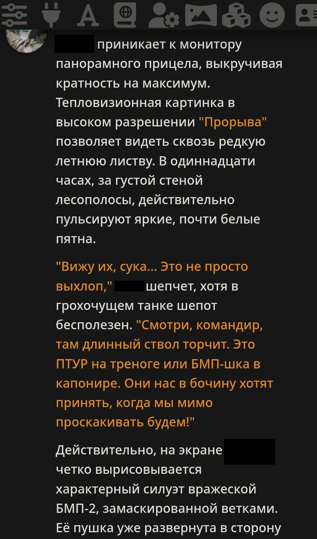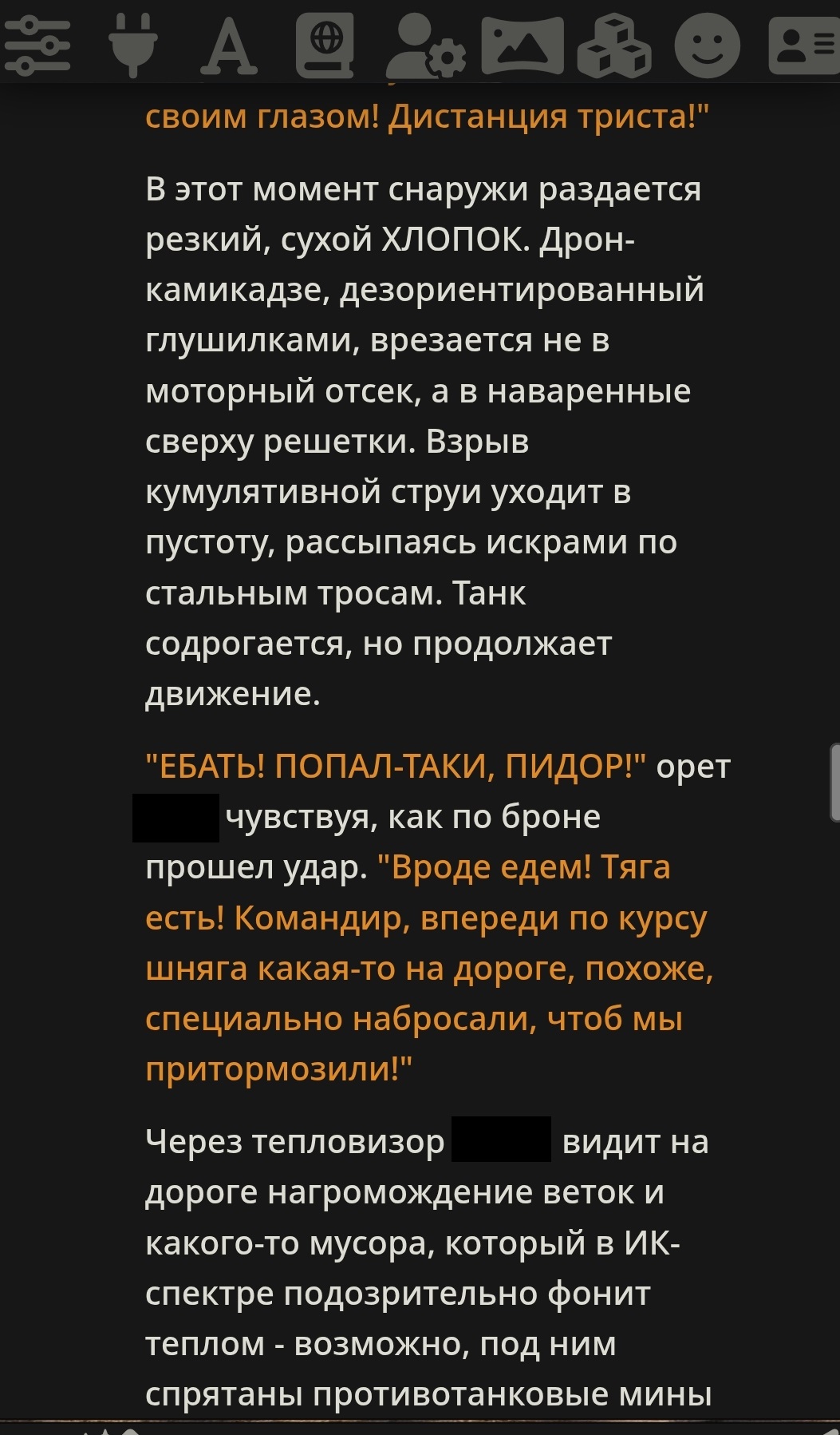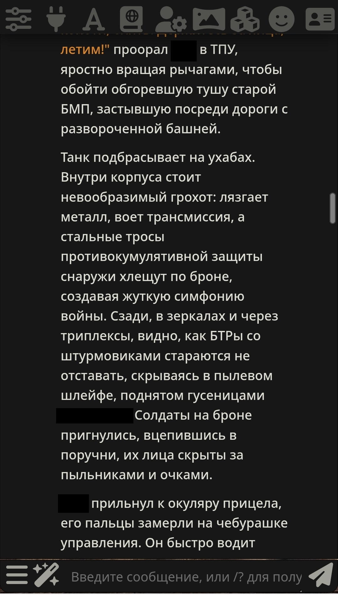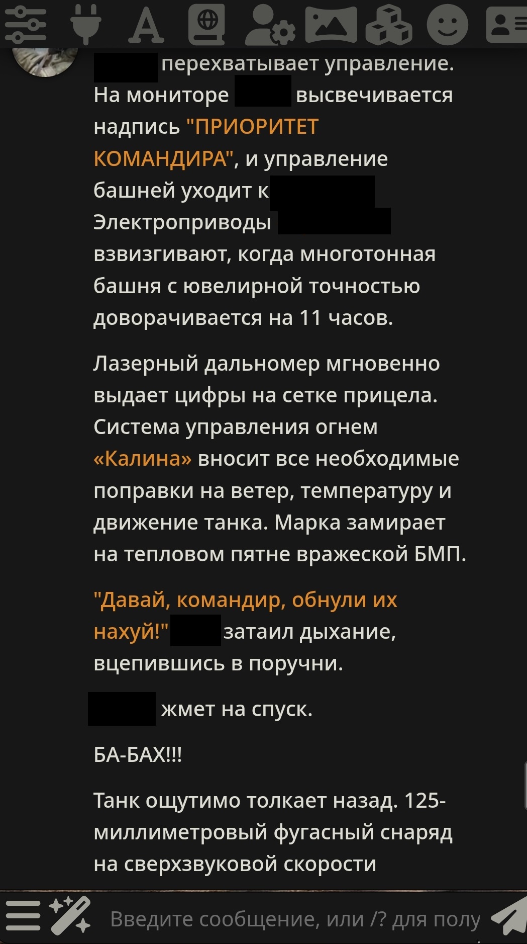 Чет я с юмором относился к вашим этим ботам. Думал просто хуитка для дешевого кума. А тут чет решил сделать карточку на основе своих приключений ИРЛ. Ожидал конечно знатного кринжа, но по итоге был поражен да я просто охуел. А сетка то вполне неплохо стелит. Процентов на 70-80 правильно пишет, знает на удивление много нюансов, сленга, некоторую специфику и т.д. Некоторые вещи додумывает конечно, а некоторые подтягивает не понимая реалий например не умеет вручную переводить взрыватель снаряда в осколочный или фугасный режим. Только втирает мне про снаряды с программируемым взрывателем и систему "Айна", которые я никогда ИРЛ не видел Сама карточка, гритинг и все общение на русском было. Из всего что читал по теме, это наверное самое лучшее. Куда лучше мясных мешков. Единственный кринж в диалогах получился. Ну и экшона на квадратный сантиметр уж слишком много. Но это фиксится промтами и нормальной карточкой.