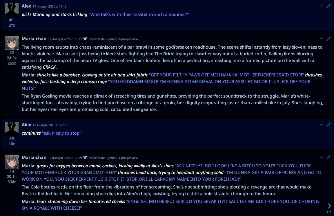 я буквально чисто физически не могу сидеть на гемини, даже с пробелами, потому что под отрез не играется то что я хочу играть из за внешнего фильтра, а что? а чего? сука обидно что и гпт мы потеряли, скоро и клода потерять можем, у меня буквально кроме клода ничего и не осталось больше, на чем играть могу. кектайский кал слишком тупой, и таким будет.