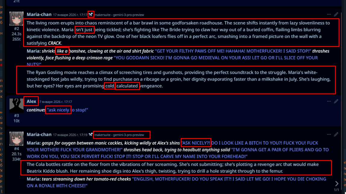 Все-таки опус был развратнее и креативнее гемини 3. Не было такого сосистент байаса. И общий байас у геминита скорее на грубость. А вот у опуса и старых клодов он был именно на порнуху. Треха в этом плане ближе к р1 и химерам.