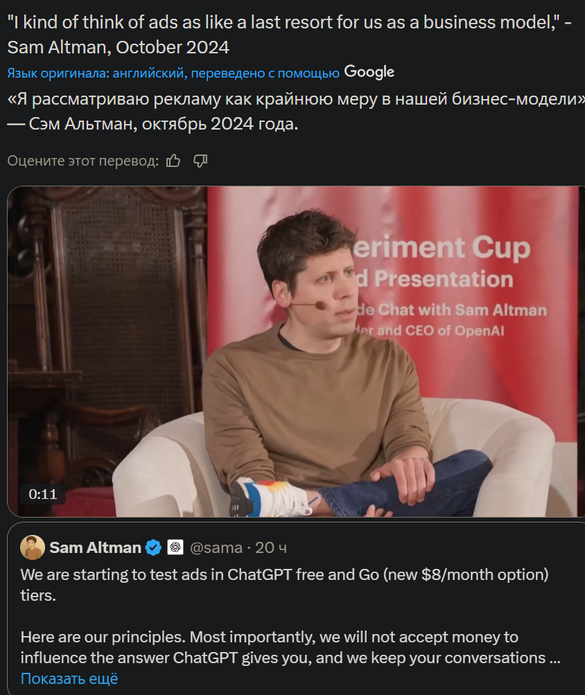 сэма альтмана подменили мне кажется, потому что смотря на этого человека я ему сразу верю, он выглядит порядочным, честным, он даже нужды кумеров понимает, гпт 4.5 это доказала, но что то произошло и вместо оригинального сэма его двойник