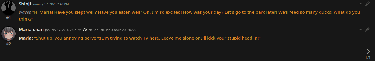 >>1494190 >4.5 И в обоих есть минусы. Соннет 4.5 такое чувство что тупее даже чем 3.7 блять. Пишет на английском имена персонажей, иногда произвольно на него переходит в описании действий. Хотя тест провожу на примере "кто такие альтушки?", 3.7 обсирается, а 4.5 нет. Опус 4.5.. просто сухой. Ну вот сухой он и всё, не выдаёт такую креативность как 4.1, 4.5(соннет), 3.7. Сои побольше, боится будто напрямую говорить как есть, какие-то вяляния жопой. Не ощущается таким живым как тот же 3.7.