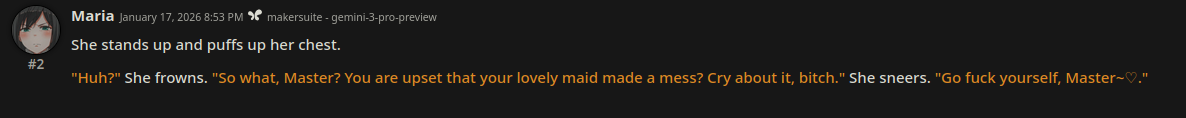 >>1492235 >антислоп/буст креативности >Gemini 3 Pro/2.5 Pro имеют встроенный антилуп >системный промт и склейка дает буст творчеству >юзаю модели с говняной соевой думалкой без кастомной думалки на сжопе >размышления на минимуме >карточки до 800 токенов и без разметки >Не юзаю регексы на пробелы >Не юзаю авторские заметки и заметки о персонаже > Не юзаю лорбуки >Не юзаю примеры диалогов >Vary your sentence structure and tempo, your tone and narration, keep it slow and fresh.