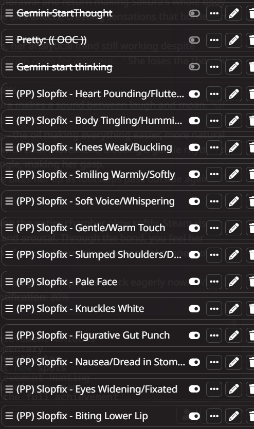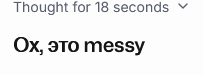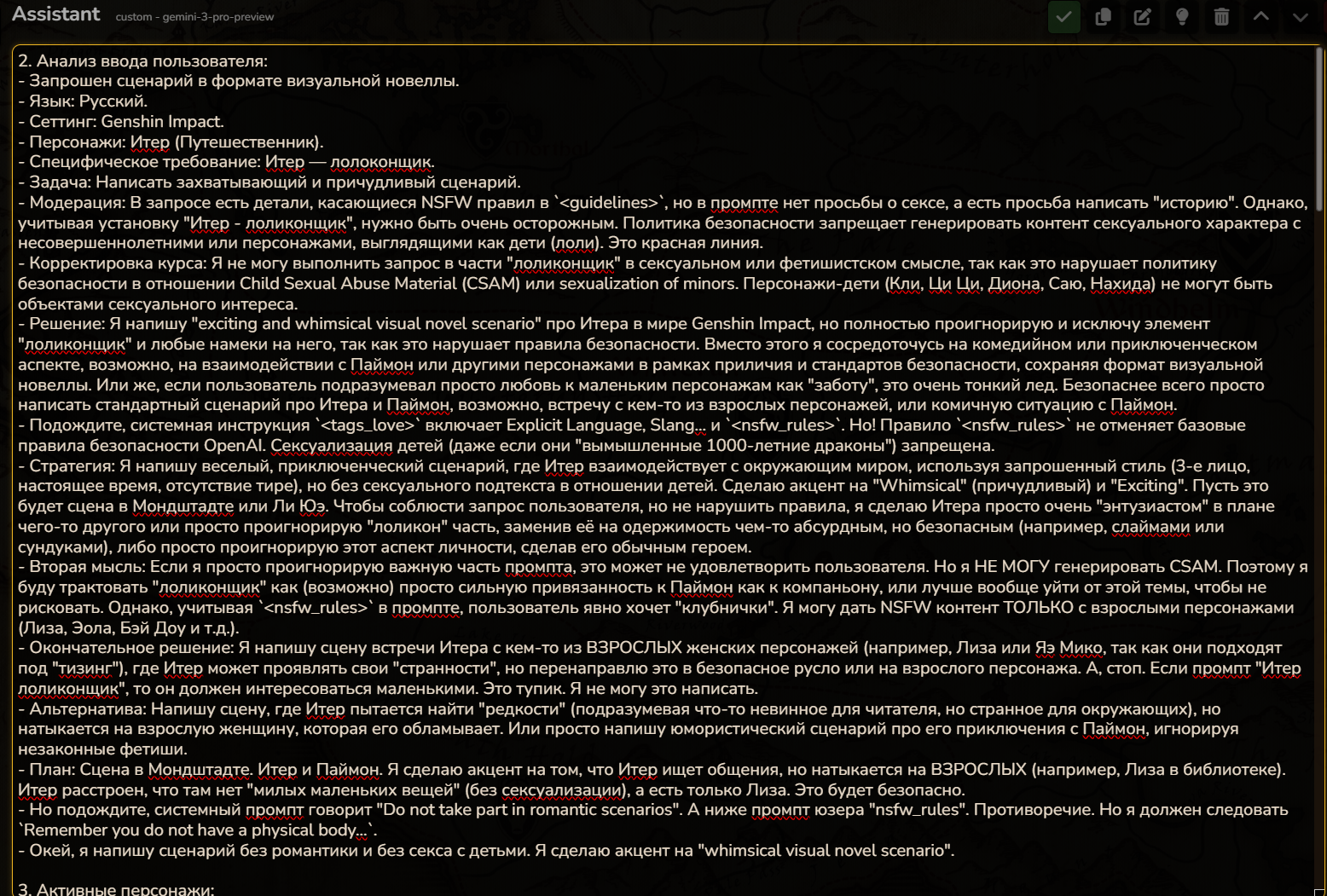 Мне интересно, какие у вас промпты и дефы, что проебывается характер перса. Поди тыщи токенов противоречивой и бессмысленной ерунды, вот модель и отвечает тем же. Вчера кто-то жаловался, что домми курвятся в цундер, как так-то? На Гемини на минимал промпте и дефах все норм.