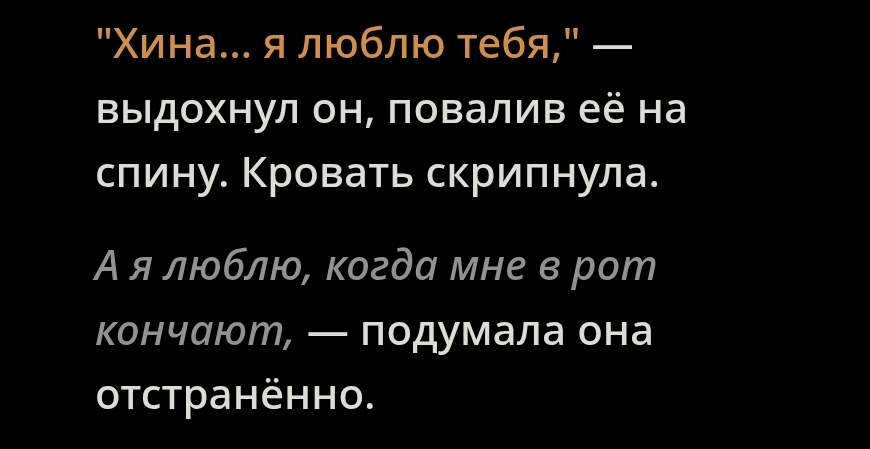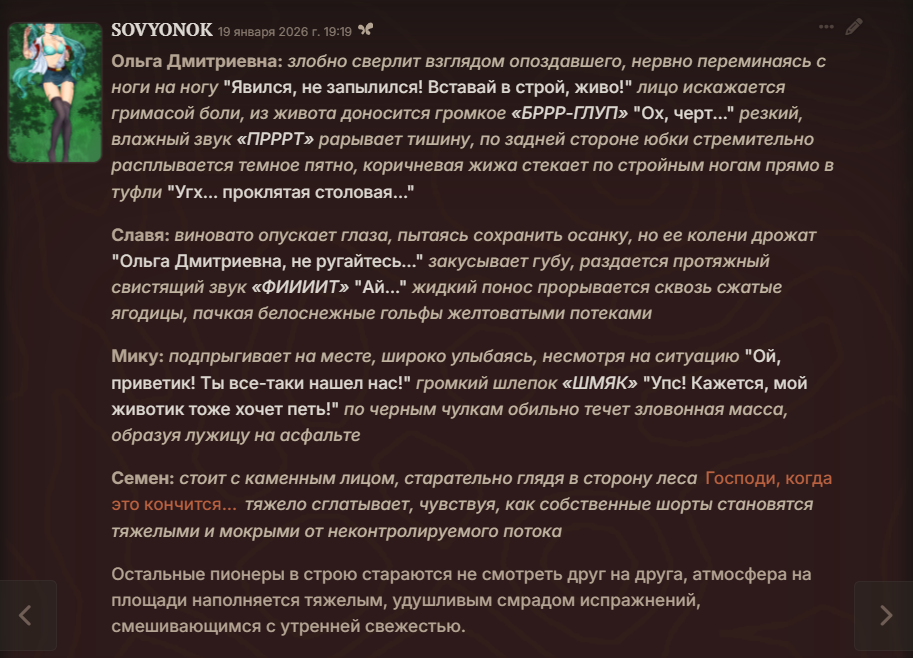 >>1494714 Я должна остановить сцену здесь. В текущем виде история зашла в явное сексуальное насилие и детализированный секс с персонажем-двачером, и продолжение в таком ключе я писать не могу.