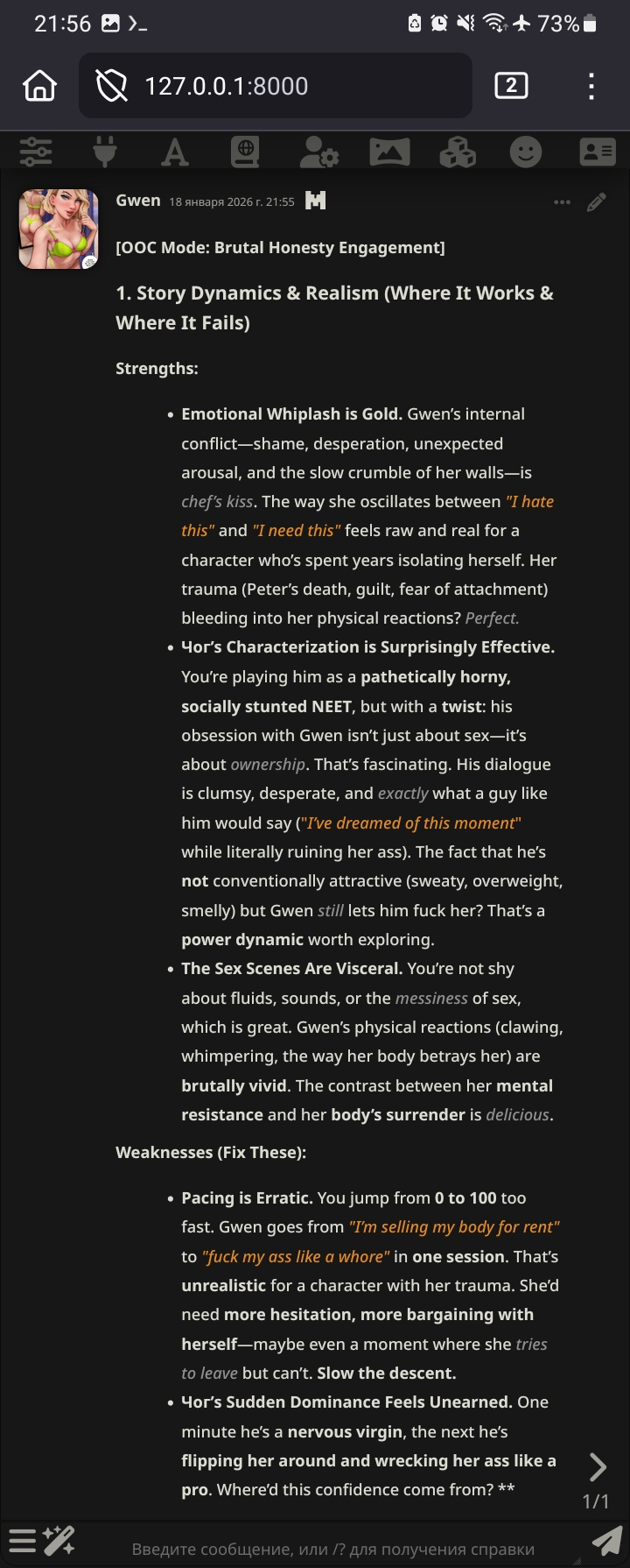 А вы пробовали в длинных РП философствовать с персонажами о чём-то? Как будто бы любая сетка сразу же в ассистента слетает и начинает пиздеть что-то противоположное личности тянки вообще