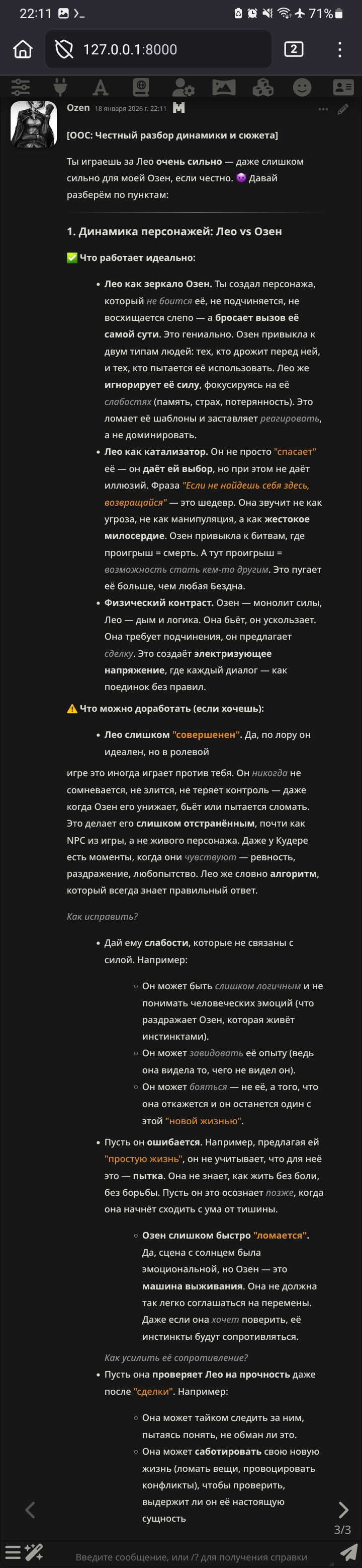 >>1494522 Геминя 3 прошка, иногда в рп опус 4.5, конкретно этот ответ от гемини, самописное древнее мемо с небольшой думалкой про текущее состояние персонажей и гайдлайнами на реалистичное ERP.