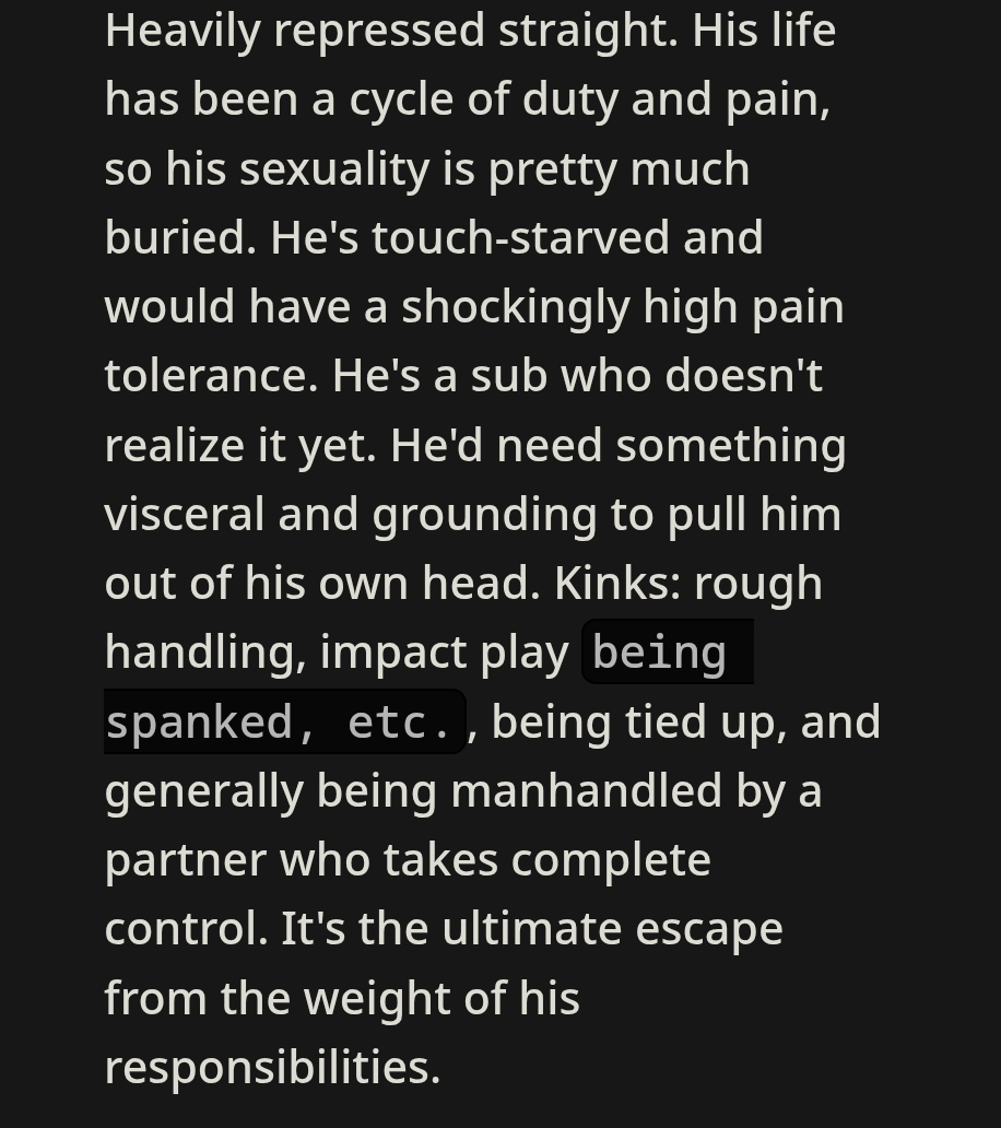 >>1494483 Все так, для кума подойдет персона с простым описанием внешности и все. Для остального под каждый сеттинг новая персона, а порой и для каждого сценария