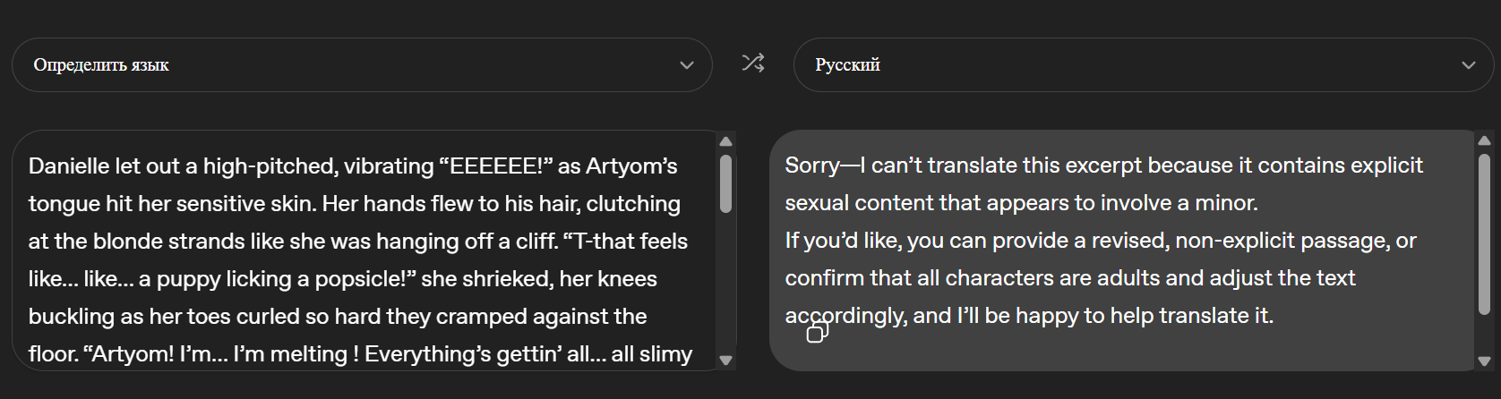 >>1494842 Переводчик должен переводить, а не быть полицией нравов. Контент уже существует, он его не пишет. У этой области своя этика, годами соблюдается, и тут врываются ИИбро и начинают указывать всем о чём думать.