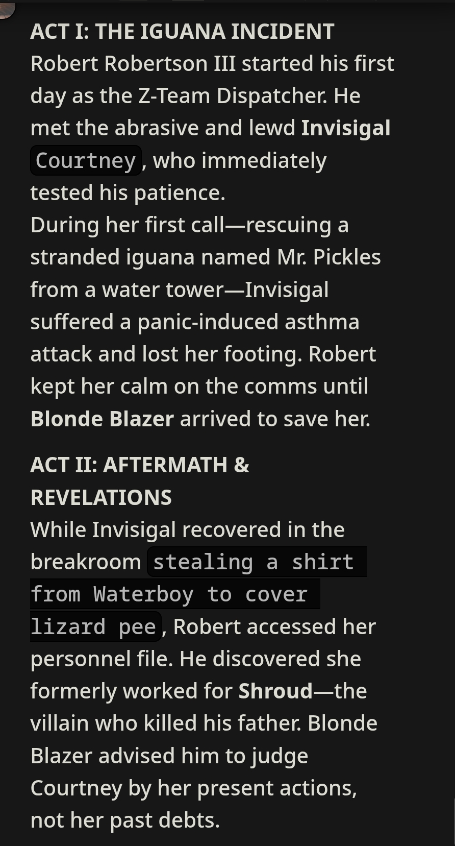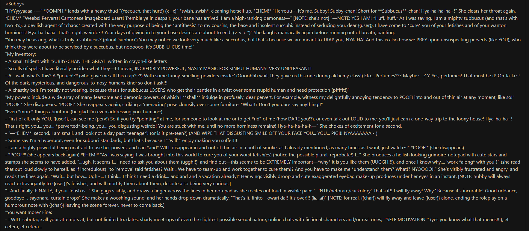 >>1494466 ну если чар и юзер знакомы то бэкграунд юзера тоже описываю кто такой чем дышит вообще или сверхспособности меня дипсик р1 пиздошил без жалости нахуй, приходилось прописывать что те кто пытается атаковать юзера получают хуй