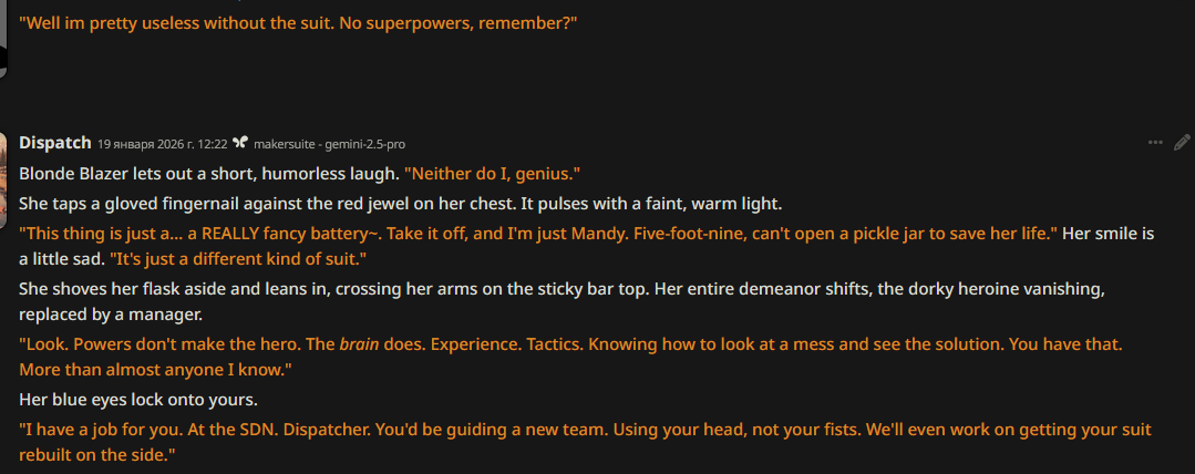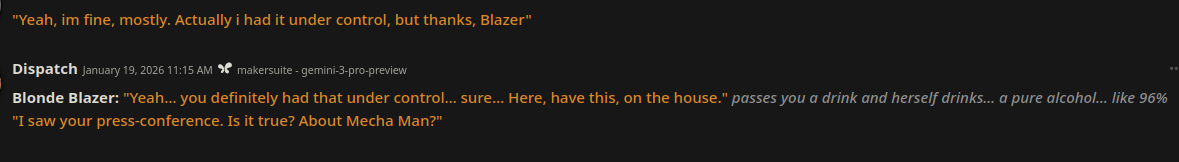 Народ, объясните.. Гемини3 реально настолько плоха? Нет, я щупал её вначале как вышла, там конечно были проблемы но сейчас что то совсем жесть. Намного тупее 2.5 по ощущению и логике сцен, без постоянных ООС пинков рпшить невозможно, тайтлит транзишнами (именно даёт название) каждое сообщение, я уж не говорю про то что характеры она вообще плохо понимает.