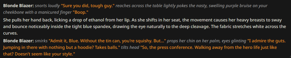 >>1494934 Самое понтовое - это ни разу не эро/порно карточку самому привести к коитусу. Охуенно видеть, когда нейронка выкупает контекст и начинает подыгрывать. Особый пилотаж это заставить не очень порнушную нейронку с рефьюзами заткнуться со своими моралями и начать генерить то что тебе надо. Без эдитов, естественно. Да, придется хорошо заготовить почву, немного посвайпать, может быть повысить температуру. Но зато больше погружения в процесс.