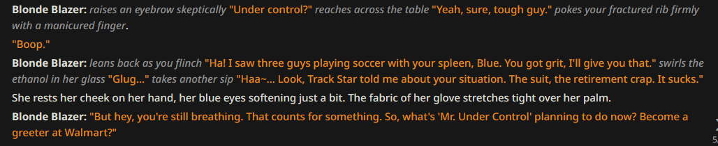[OOC: pause the story! What do you think about current dynamics? What do you think about the story so far? Am I doing well playing as {{user}}? Be brutally honest]