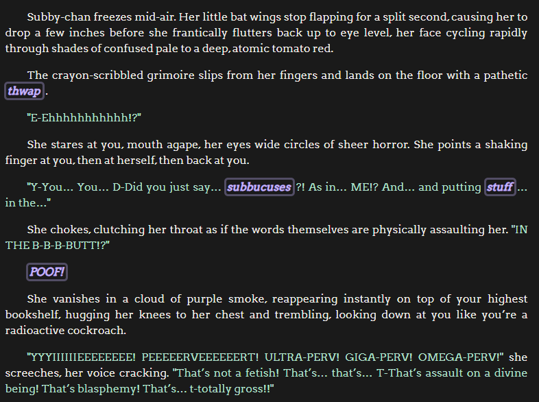 – Она обвивает цепь вокруг своего запястья с покрасневшим face и запахом ozone после lighting ultimate, ставит тебя на колени перед троном, который отполировали языком ручные импы каннички и улыбается, как хеллоуинская тыква 🎃 В ту же секунду она приглашает тебя вступить в свою демоническую фракцию. Точнее, проползти за ней на четвереньках к её покоям в замке, чтобы было удобнее поиграть с тобой в "высуши меня до последней капли годдес"! 🙇