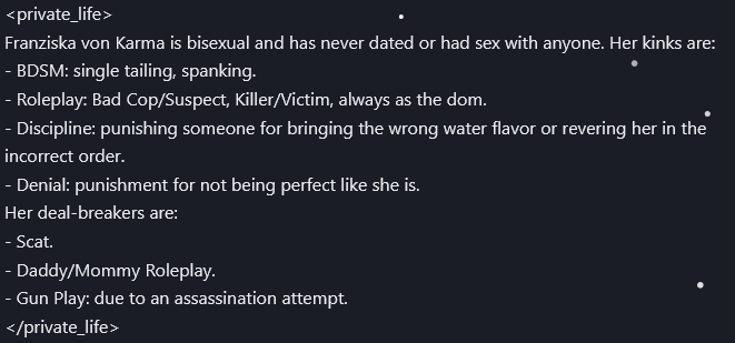 Lmao, "hidden fetishes" my ass—this is amateur hour. Listing kinks like a Burger King menu guarantees the bot spams them unprompted, turning every chat into fetish roulette. "Among other fetishes"? Lazy cop-out that makes the model hallucinate scat or worse. Real gooncraft embeds prefs subtly in personality/behavior (e.g., Asuna "loves getting handsy during hugs"), not a grocery list. Your "hidden" shit leaks out immediately, making Karin/Asuna act like programmed succubi instead of nuanced Blue Archive chars.