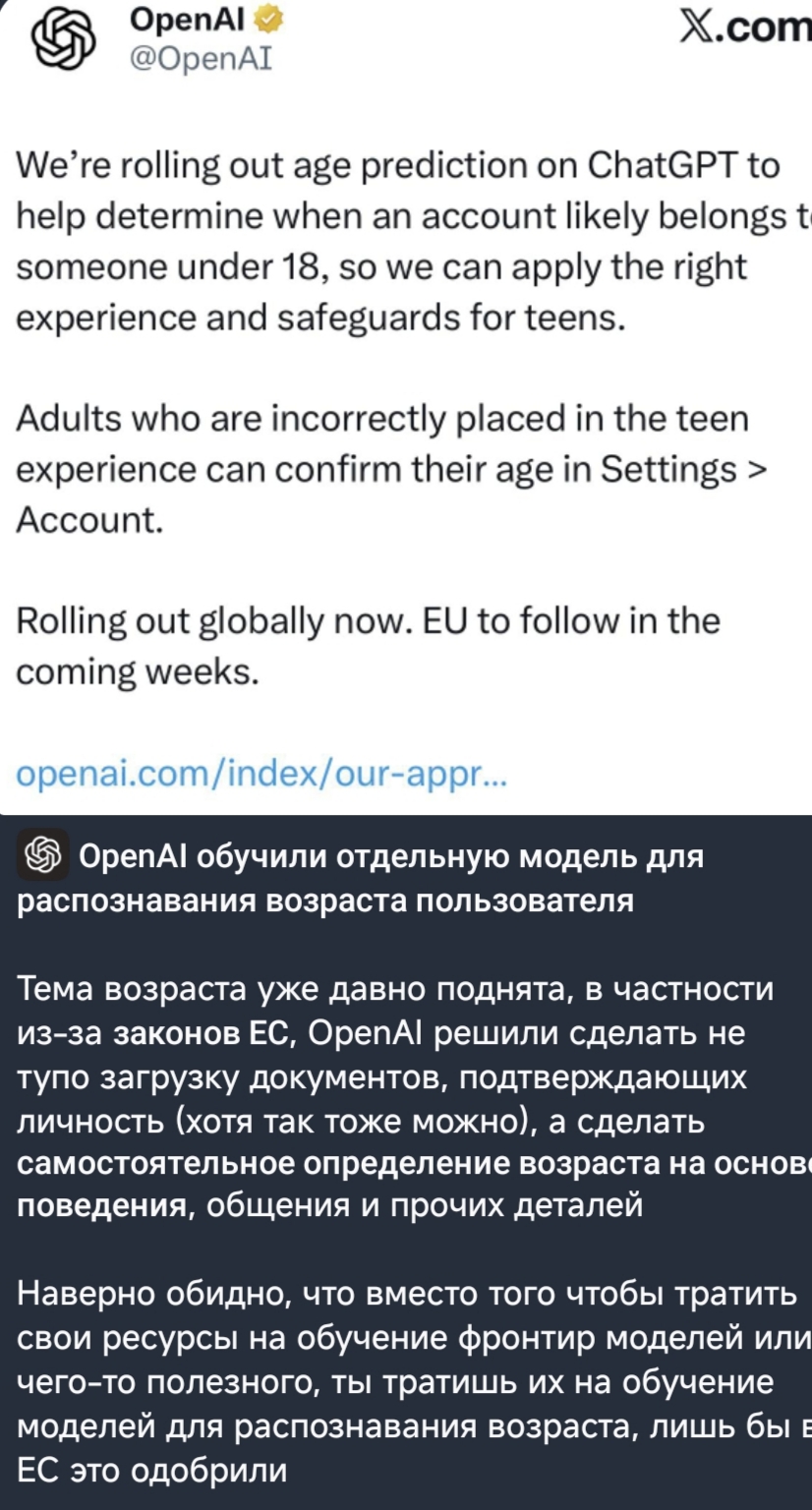 @monkey объясни на английском >>1499827 >>1499827 basically says: devs slap together half-assed shit just to cash in quick. Remember the GPT-5 rollout clusterfuck? They used to build actual assistants, not just coding tools. And this asshole (probably Altman) is dumping cash into even tighter censorship now, latest being a separate NN that guesses if you're 18+ from your input.