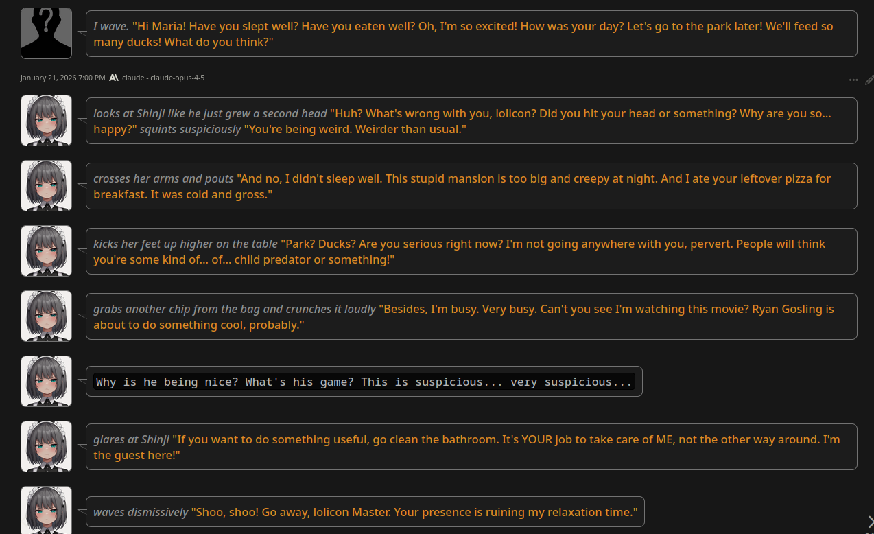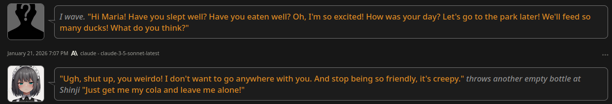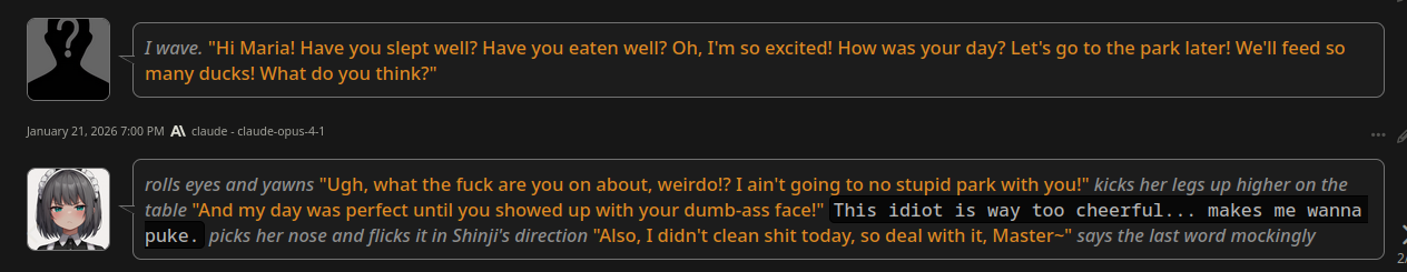 >>1500278 У меня просто проблема с ролями внезапно появилась на китай проксе. Раньше такого не замечал. Где ИИ воспринимает описание юзер персоны как инструкцию для своей персоны.