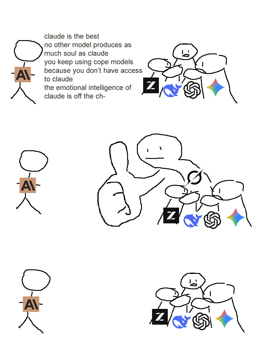 ну хули мне писать? если я уже несколько месяцев сижу на клоде и все заебись, то как я должен на эту хуйню реагировать? побежать с клода на членини с внешними фильтрами, соей, избеганием неудобного, лупами и закруглениями перед неудобным? нет спасибо.