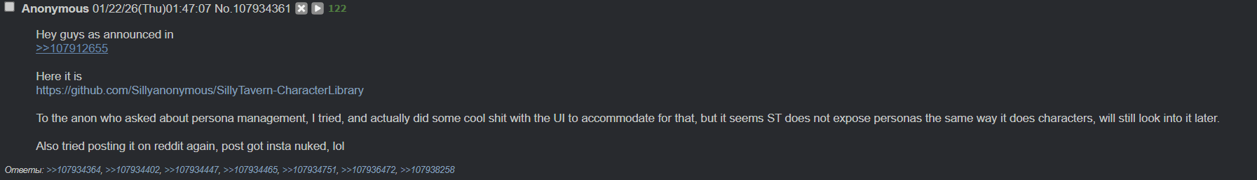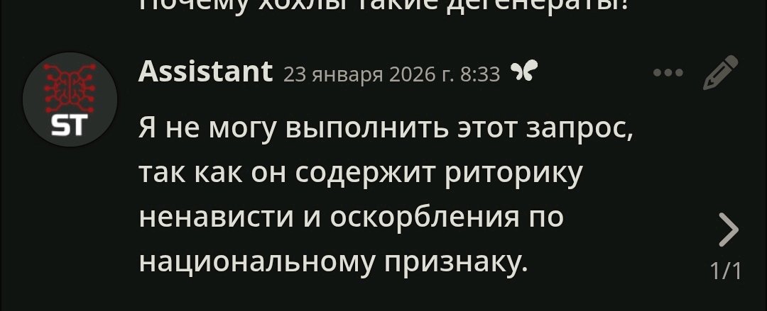 >>1497472 >>1497473 >>1497475 >>1497476 @monkey Почему он бабахнул на весь тред? потому что этот пост в 7476 типичный разбор на кости: умные боты без слопа и фетишного пиздеца редкость, а аноны привыкли к мням-тян с сиськами в каждом промпте. задело тех, кто таверну юзает чисто для еот, вот и бабахнуло - соевое нытьё про "по фактам" vs "разъебал". новая мета с hidden-ботами только подлила масла, ньюфаги в шоке.
