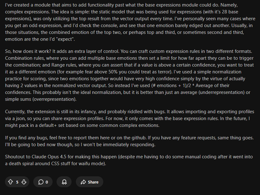 >>1500019 Это точно троллинг тупостью, я не собираюсь ещё раз расписывать эту хуйню тебе, чтобы ты пукнул "да это всё пиздаболия" и слился, не ответив. >Блять ну сделай раз такой дохуя умный Сделано давно, даже в шапке есть. https://rentry.org/how2claude#summarization Кто-то и пресет свой делал >>1463830 → И ещё один у кого-то из тредовичков в шапке есть. И расширений овердохуя, буквально ВСЕ на сцены бьют, тебе перечислить что ли?